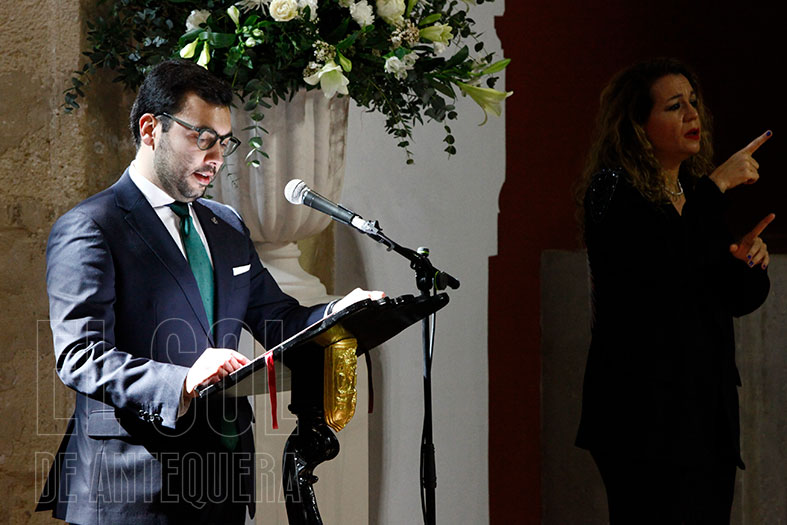 Seguidamente entraron al interior de Santa María donde a las 12 se desarrolló el acto de entrega de ‘Efebos’, bajo presidencia del alcalde Manuel Barón y las tenientes de alcalde Ana Cebrián y Elena Melero, así como conducción del acto por Raúl Rojas, del Gabinete de Alcaldía. Sus palabras y las de los premiados fueron mostradas al instante en lengua de signos. Al fondo, dos jóvenes como maceros municipales y flanqueando la mesa principal, un friso y dos grandes jarrones de flores.