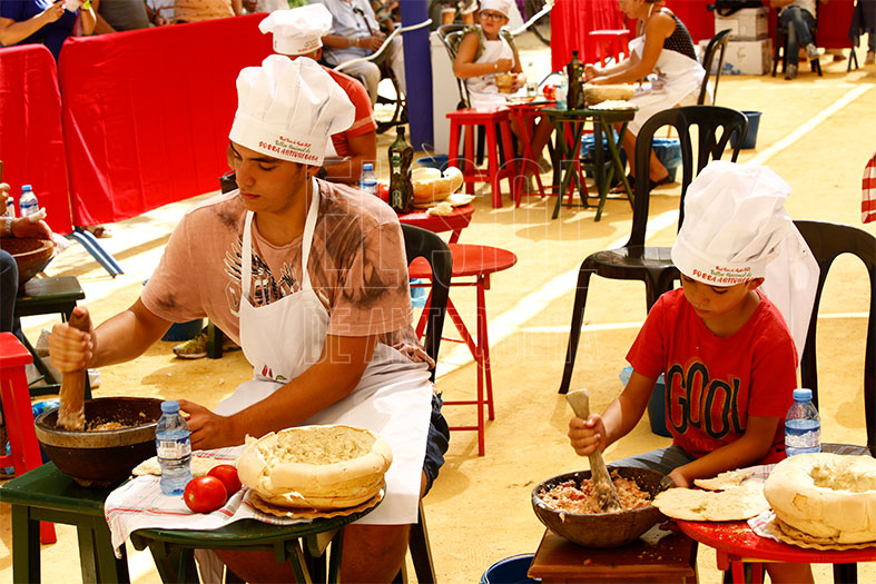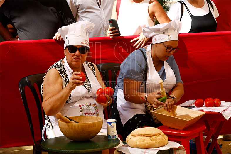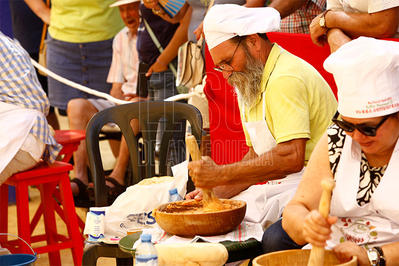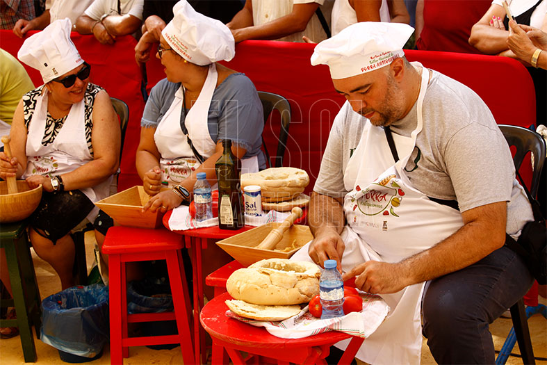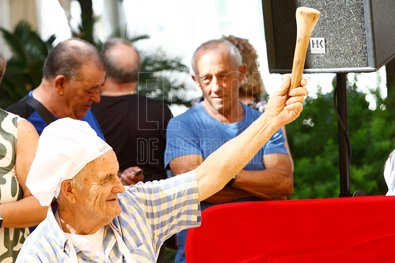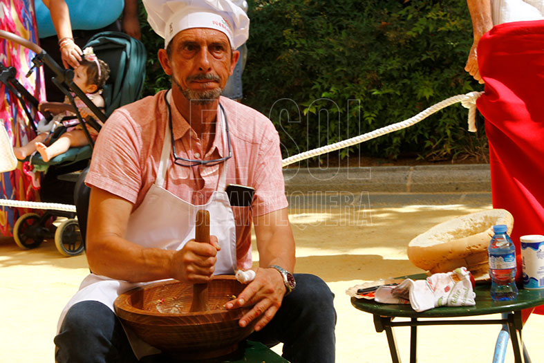 Este año, el del 275 aniversario de la Real Feria, se optó por dar una clase en vez del tradicional concurso. Se pedía acudir con la maja y el dornillo, mazo y plato especial para elaborarla, para empezar la aventura entre una y dos horas a realizar el típico plato a mano.