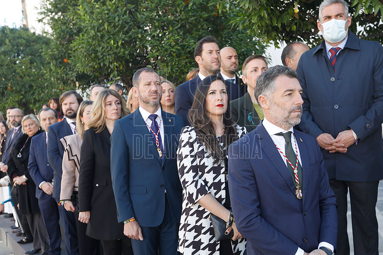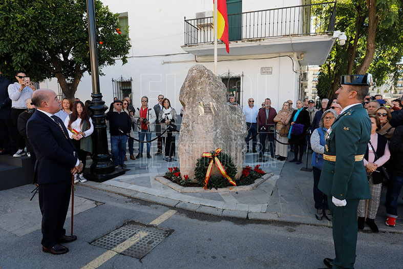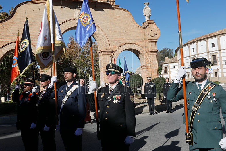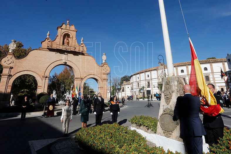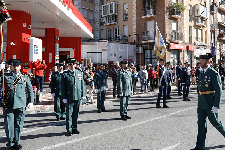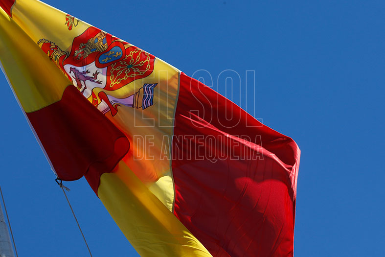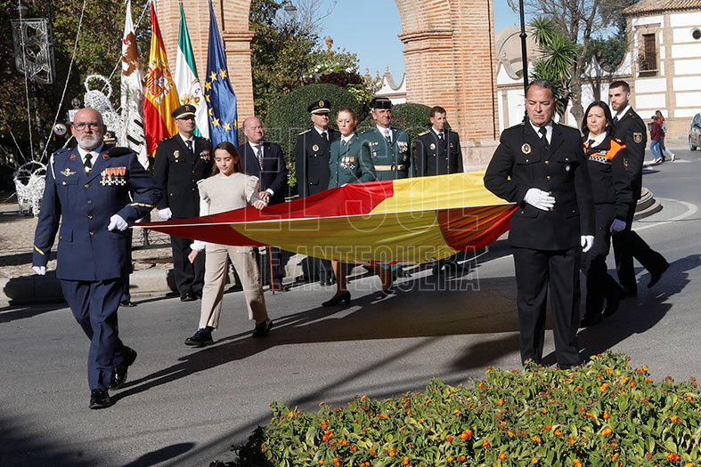 Reparto de banderitas de España entre el público asistente y a las 12 del mediodía comenzaba el acto dirigido por el Jefe de Prensa y Protocolo del Ayuntamiento, Pablo Javier Guerrero. Desfile inicial de la representación de la Guardia Civil, Acuartelamiento de Bobadilla, Policía Nacional, Policía Local y Protección Civil, todos ellos abanderados. Desde la Alameda de Andalucía partieron hasta colocarse frente al Cuartel.
