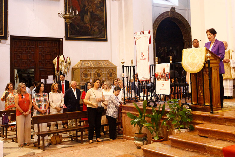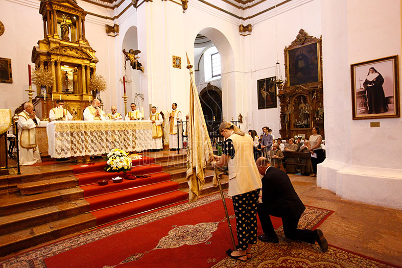 A las 9 de la mañana comenzaba la misa en la iglesia mayor y colegial de San Sebastián. Con participación de las distintas Cáritas Parroquiales, familias con sus hijos de Primera Comunión y las franciscanas cantando en varios pasajes. Por el Ayuntamiento, el alcalde Manuel Barón al frente y la edil más joven, Marta González, portando el Pendón de la Ciudad.