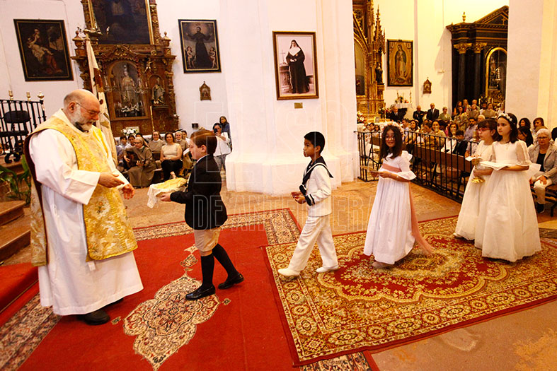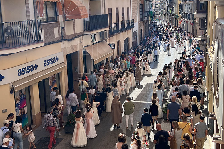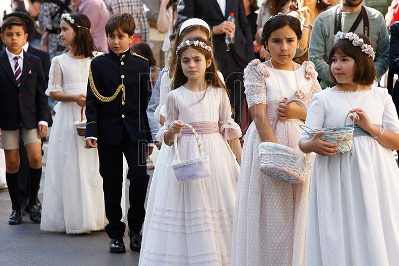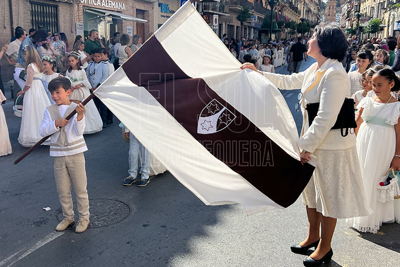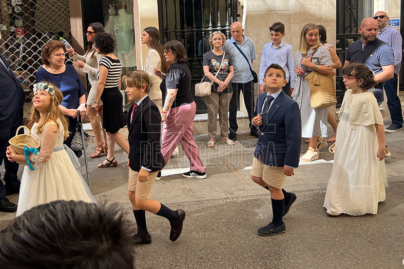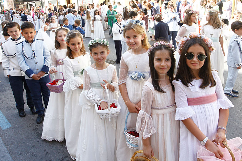 Empezaba la procesión las cofradías de Pasión y Gloria con sus guiones, para seguir los niños de Primera Comunión de los diferentes colegios y parroquias. Seguía la representación de Cáritas, la banda y el coro de las franciscanas de Madre Carmen con sus religiosas, entre ellas la Madre General Joaquina González Salas, y la Custodia.