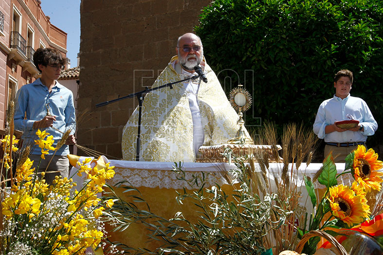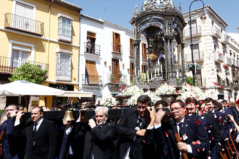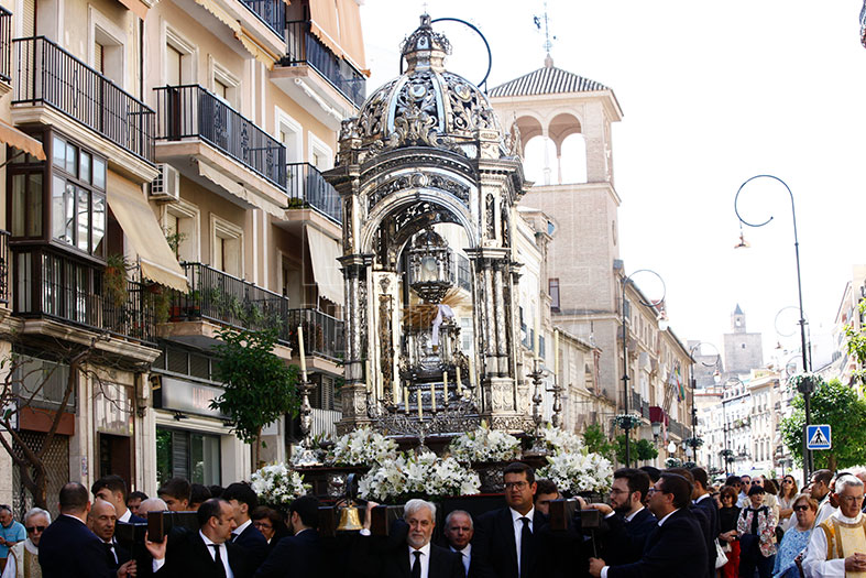 Tras la misa, partía el cortejo con Jesús Sacramentado, trasladado desde el sagrario hasta la Custodia, para lo que el Arcipreste cedió al orfebre José Manuel Cantos que colocara el viril en las andas.