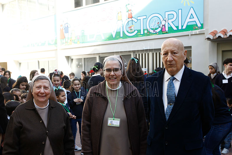 Momento en el que la directora del colegio, hermana Carmen María Gómez y la profesora Eva Díez de los Ríos, le dieron la bienvenida ante la presencia de los jóvenes estudiantes. Lo presentaron como el científico que es, relacionado con el mundo de la inmunología y el ibuprofeno.