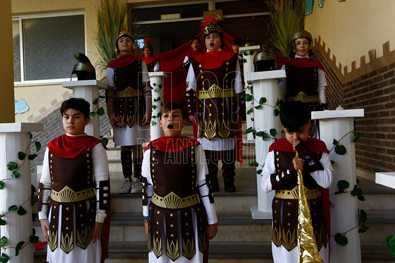 En el primer patio del colegio, diferentes escenas de la ciudad de Belén, desde una panadería que hace hasta molletes de Antequera, hasta una carnicería, puesto de alimentos, mantecados, guardia romana, coro y una zona de recreo.