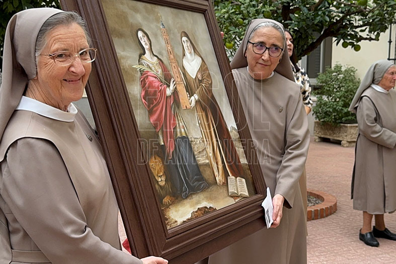 La Madre General agradeció la entrega del cuadro en este Tiempo Jubilar y la comunidad cantó el Himno a Santa Eufemia, trasladando el lienzo al interior de la iglesia, la propia Madre y la Superiora de La Victoria.