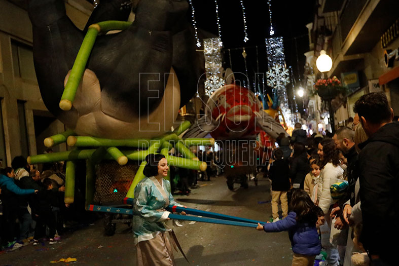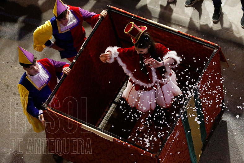 Seguía la primera de las carrozas, de Brave, con Mérida y los personajes de la historia, llevados a cabo por el AMPA del Colegio María Inmaculada. A pie de calle, la Bella y la Bestia levantaba pasiones con una carroza final de Fireumas. Y tres grandes cajas que levantaban la pregunta de qué contenían y al parar, surgían desde su interior, bailarinas, levantando los aplausos de los presentes.