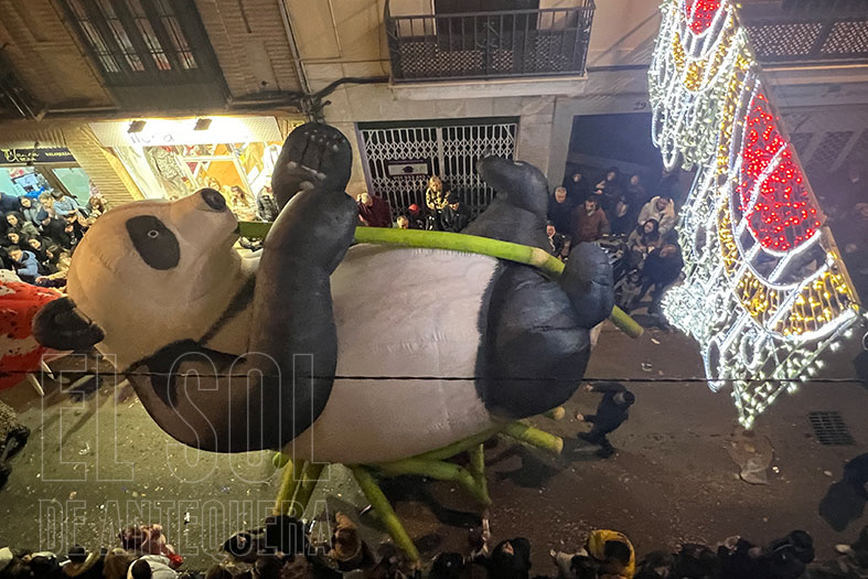 Banda pasional de las Flores de Málaga y el primero de los Reyes, Melchor, seguido de grandes personajes de Alicia en el País de las Maravillas, estrellas de Navidad, el Rey Gaspar, una comitiva china con grandes animales (dragón y oso panda) y el Rey Baltasar.
