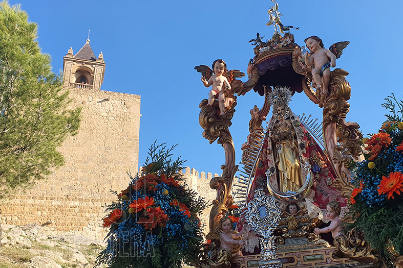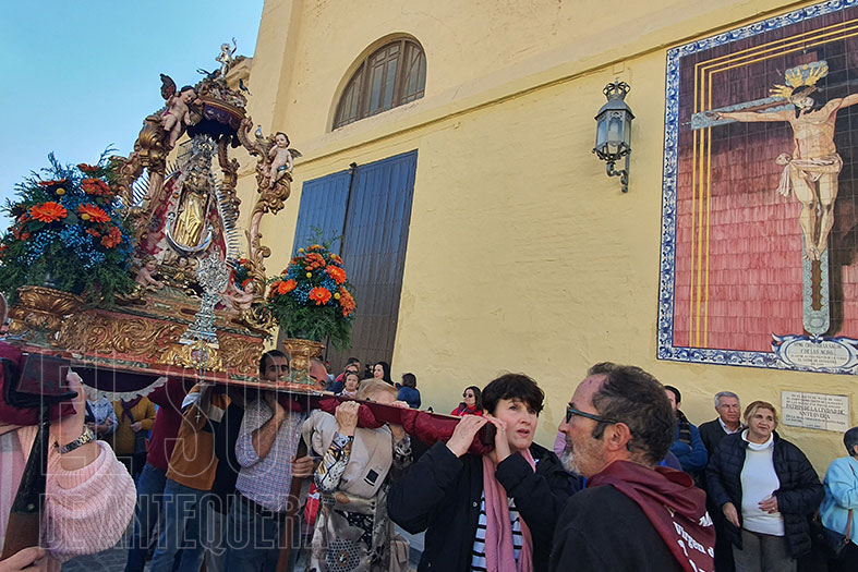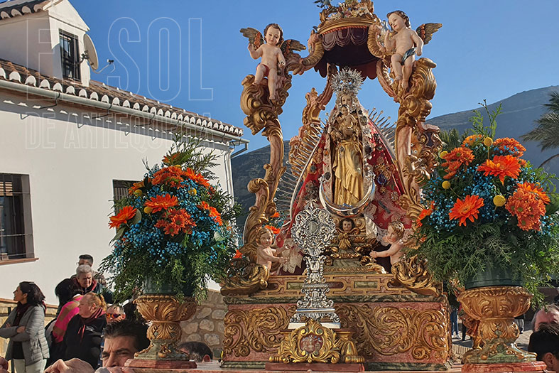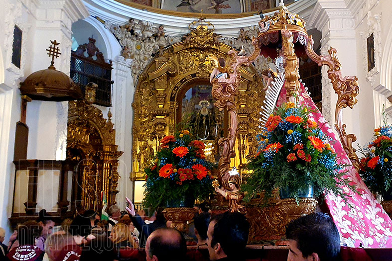 Tras la suelta de palomas, compleja salida de la Virgen en su templete desde la Virgen de Espera, cada año más lucido, barroco, con identidad granadina y antequerana. La devoción de los vecinos, de los jóvenes de la tierra que pueden con todo o casi todo.