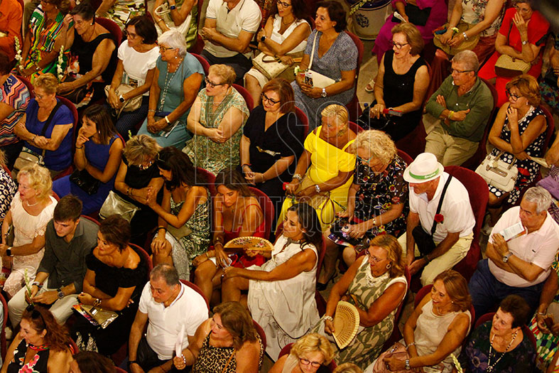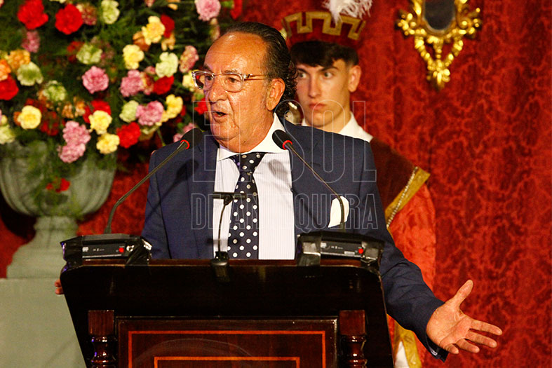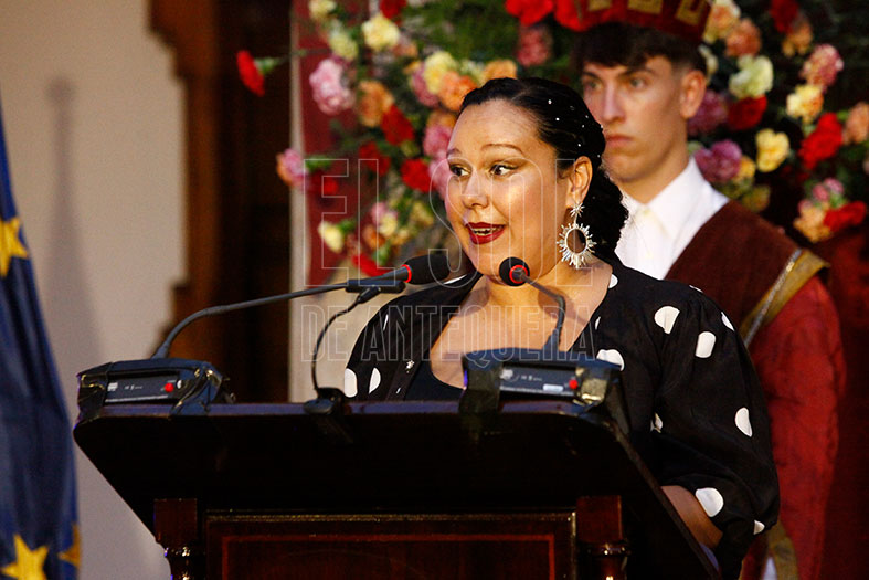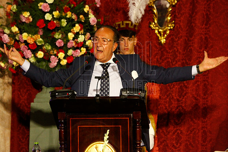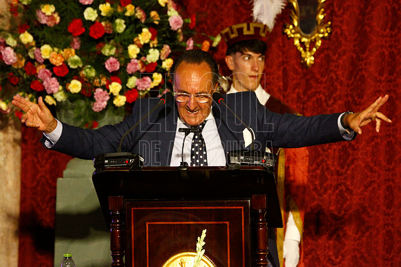 Bajó de nuevo para entregar tres ramos de flores, dos a sus hijas y uno a su tía presente entre el público. Y si empezó con emoción, terminó con ese arte como mostró en todo su texto: «Este pregonero se despide de la mejor manera que sabe y no podía ser de otra que con un pasodoble español: ¡Que viva España de Manolo Escobar!».
