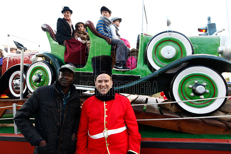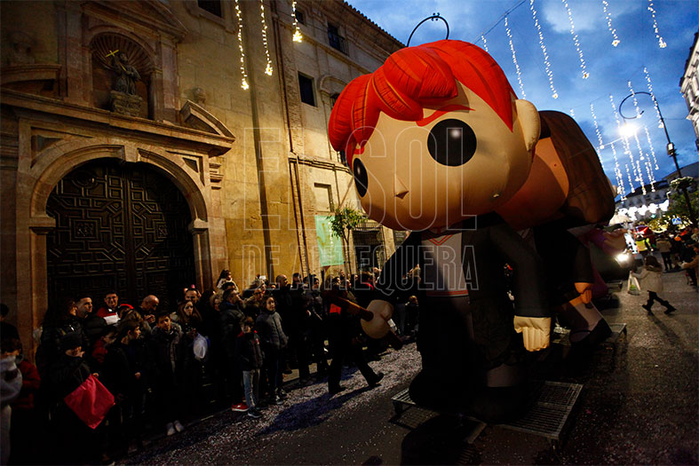 Vehículos de época de Aventura Solidaria con personajes de Playmobil y reparto de los muñecos junto a las carrozas de los Reyes. Turno para gigantes de Harry Potter y carroza de Cenicienta de la Hermandad del Rocío. Tres gigantes Playmobil con las figuras de los Reyes Magos y el primero de los tronos, del Rey Melchor.