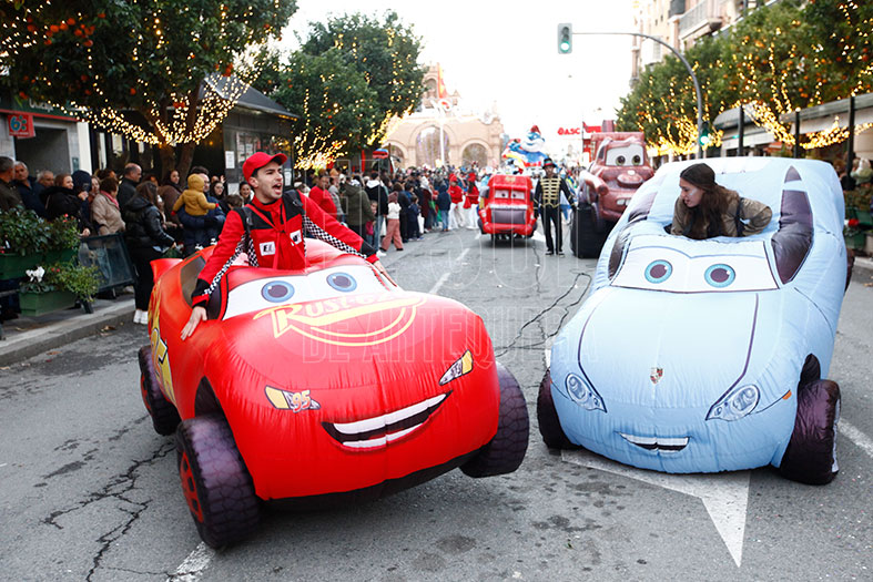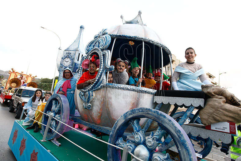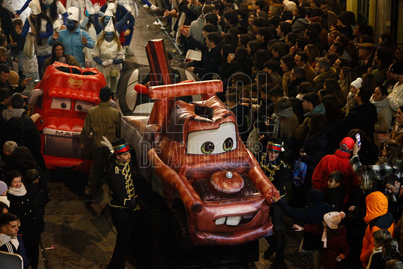 Arrancaba el cortejo una batucada africana, seguida de la carroza del Belén Playmobil del Club Social Matagrande. Continuaba un grupo de personajes de Scooby Doo y la carroza de Dumbo llevada por la ACIA. Seguías coches de Cars que chocaban con el público y la carroza de Pitufos de la Escuela de Magisterio.