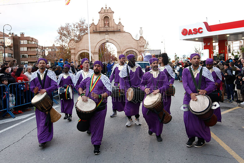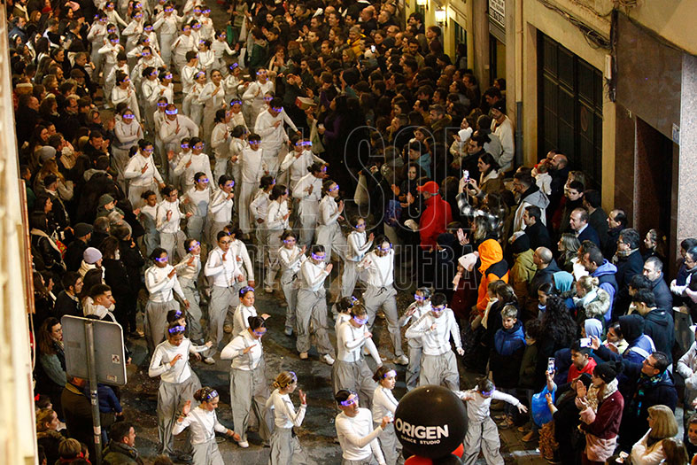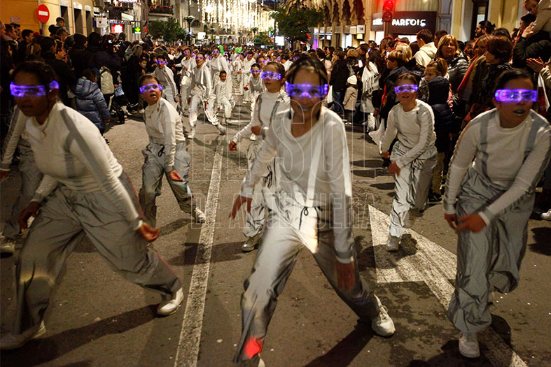 Seguía el grupo Origen que marcó el ritmo y las sensaciones de la cabalgata. Si ya sorprendió el pasado año por su coreografía y baile, éste lo hizo además por la indumentaria y por el centenar de integrantes. Las calles se quedaron embobadas con lo que vieron. Aplausos para ellos.