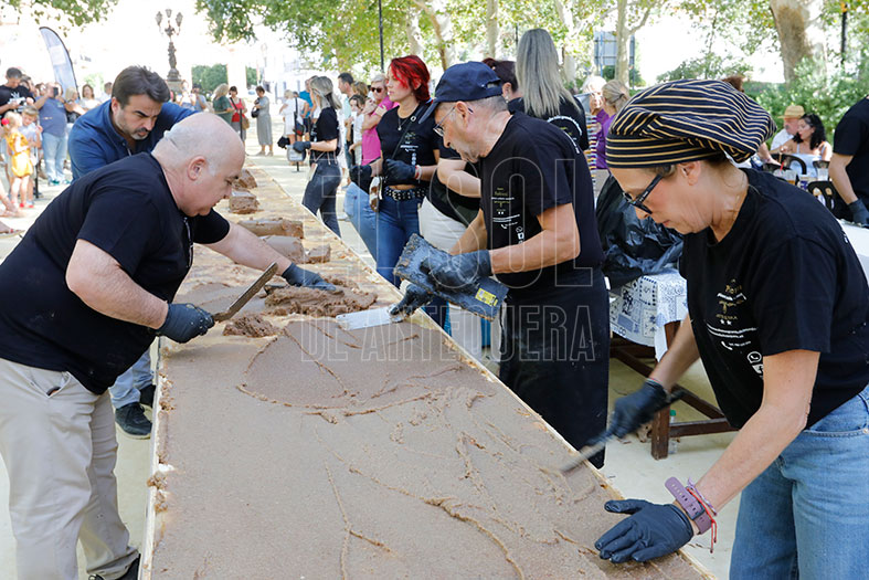 La reconocida firma pastelera ha estado tres días preparando los ingredientes y tras montar las mesas por la mañana, comenzó a elaborar el postre en la sobremesa. «Hemos empleado 3.200 huevos, 125 kilos de cabello de ángel, otros 125 kilos de almendra, 100 kilos de azúcar, 65 litros de almíbar, 30 kilos de azúcar glas y 85 planchas de bizcocho con almendras». Todo preparado como marca la antigua receta del postre medieval que conservaron los conventos de clausura y que hoy es un fijo en las cartas de los restaurantes de la ciudad.