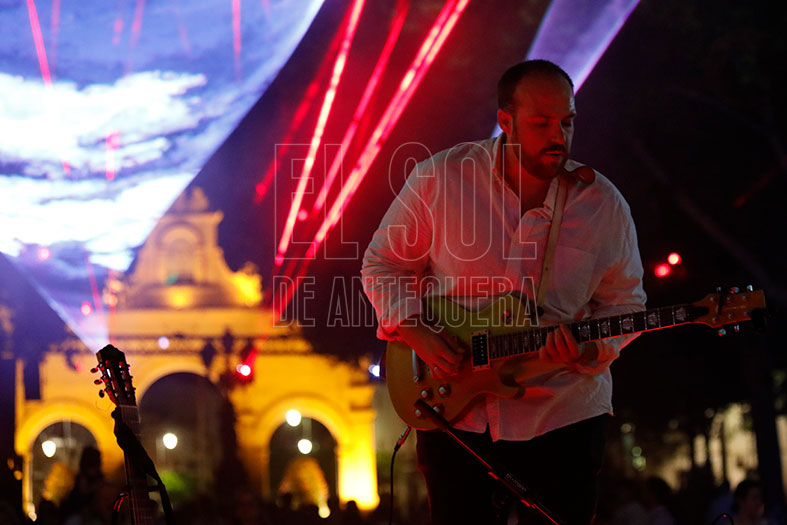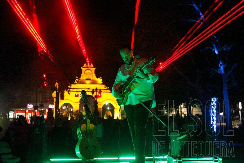 Tras varios días de montaje, pruebas y la fiesta de Los 40 Principales del jueves en la Plaza de Toros, anoche comenzó el octavo aniversario como Patrimonio Mundial del Sitio de los Dólmenes de Antequera. ¡Y de qué forma! De nuevo en videomapeo en la fachada de Santa María, como se demanda. Y este año, un paseo hasta la zona llana para terminar en el Paseo Real. Espectacular Elías Rivera, que domina con nota la guitarra más allá del flamenco.