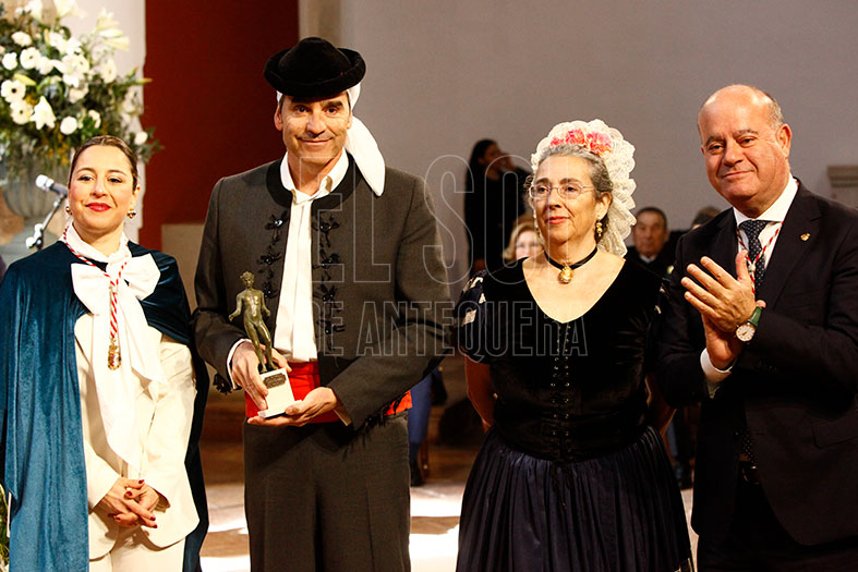 Fue exponiendo el acuerdo municipal de cada galardonado y llamando a cada uno para que recibiera el Efebo de manos del Alcalde y de un miembro del equipo de gobierno. El primero fue el de Colectivos para el grupo folclórico Azucena. Lo entregó Barón junto a la teniente de alcalde Elena Melero. Lo recibieron Pablo del Campo Castillo, presidente, y Rosa Mari Bracho del Río, directora de baile, que fue quien habló. Ambos iban vestidos con el traje típico antequerano.