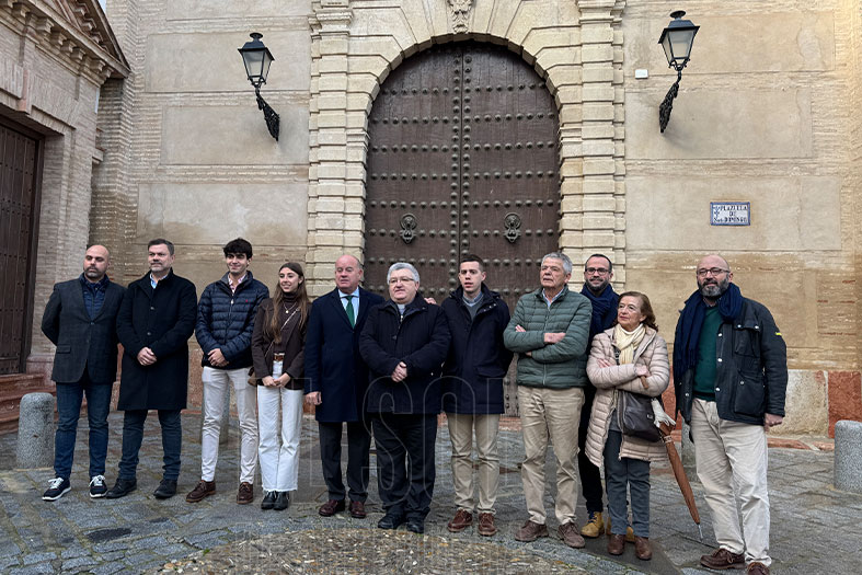 El alcalde Manuel Barón, junto con el concejal de Patrimonio, José Medina con el sacerdote de la parroquia de San Sebastián, Serafín Corral y distintos miembros de la Cofradía de la Paz y del Rosario.