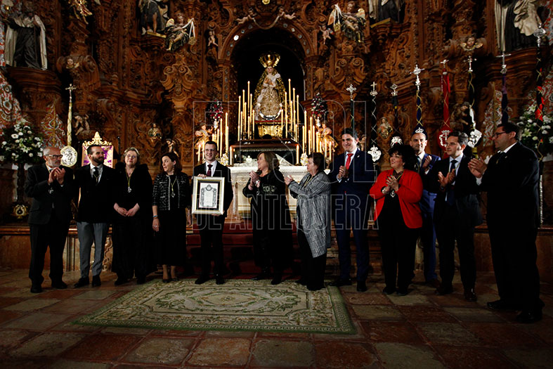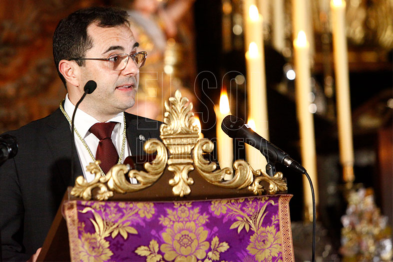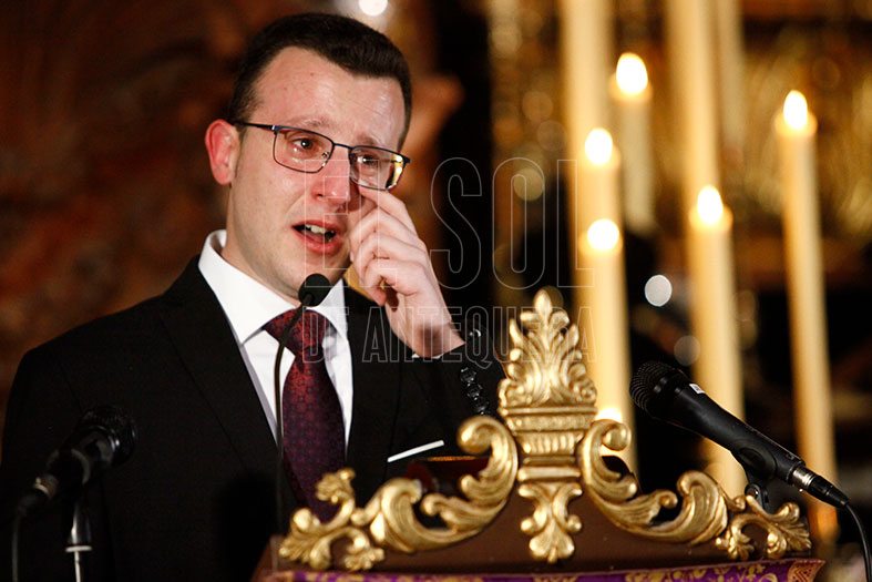 Tras una fuerte ovación, la Agrupación de Cofradías por medio de su presidenta Trinidad Calvo y la Junta Permanente, le entregaron el título de pregonero, siendo felicitado por todas las personas que acudieron al templo. Así, el vecino del Carmen, el cofrade de todas y el presentador hoy de Onda Cero y 101 Televisión, cumplió su sueño de niño, el de poder pregonar su Semana Santa y más a los pies de su Virgen de la Soledad, en el barrio del Carmen junto a su madre terrenal.