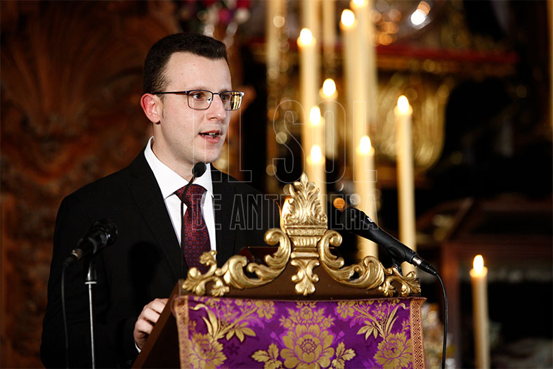 Tras realizar un cántico a Antequera, hizo su camino de Pasión, Muerte y Resurrección por medio de las distintas imágenes que se procesionan, sin orden de día de salida y de cofradías, buscó su visión sobre cómo es ese camino. Reivindicó el papel de los que integran el cuerpo procesional. «Nazarenos, penitentes, capiruchos, da igual como les llames pero no olvides su espacio dentro del cortejo. No tengas miedo hermano a ponerte un capuz cuando ya no puedes ir bajo sus andas, cuando ya no sabes donde estar, vístete con tu túnica, cíngulo anudado y con respeto, acompaña con tu luz en el Camino».