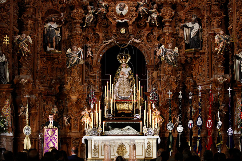 Fue ahí cuando empezó su canto a la Virgen de la Soledad. «Madre de la Soledad sigue protegiéndonos. Madre de la Soledad no nos sueltes de tus manos. Sabemos que llevas los clavos y la corona de tu Hijo de tu Hijo yacente amado. Cuánto amor desgarrado entre esos benditos dedos entrelazados». Seleccionó los nombres propios en su exaltación donde no pudo faltar la eterna camarera de su Virgen, doña Blanca Cerezo de Luna. «Nuestra querida Blanca, que desde el cielo admirará entusiasmada a Nuestra Madre como cuando bajaba por Cuesta de los Rojas y le esperaba en su balcón emocionada de ver conseguido que el patrimonio de nuestra Antequera, de nuevo era utilizado para seguir potenciando tu amor, el amor a Nuestra Madre, para que nunca nos falte y siempre nos acompañe».