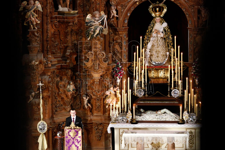 Acertadamente, la Virgen de la Soledad y el Cristo Yacente permanecían en el camarín del Altar Mayor como lo hicieron en su triduo cuaresmal. Atrás quedan años donde no se permitió que imágenes titulares presidieron un pregón en un templo. Si barroco es el Carmen, más lo es cuando la Virgen de la Soledad se convertía en luna de esperanza sobre el cuerpo sin vida de su hijo.