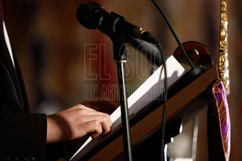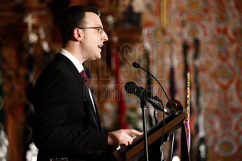 Expresó su declaración de intenciones: «Hoy, vengo ante vosotros para exaltar lo que Antequera siente cuando llega la primavera, cuando de nuevo los atardeceres languidecen y la flor vuelve a la ribera. Hoy vengo ante ti, también para exaltar la Pasión que viven los hombres y mujeres de nuestra tierra cuando llegan estas fechas, ser voz de voces que aún calladas en el más absoluto silencio te rezan. Hoy vengo ante ti, para hacer un paréntesis de nuestras vidas, y decirte Antequera, lo que ocurre cuando la primavera llama a nuestras puertas».