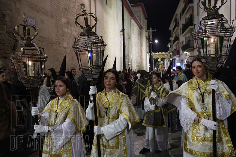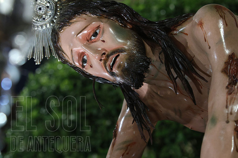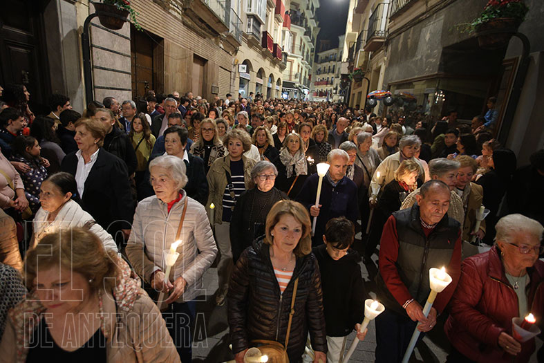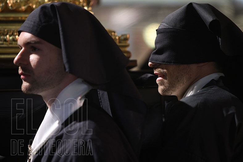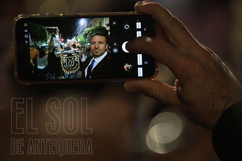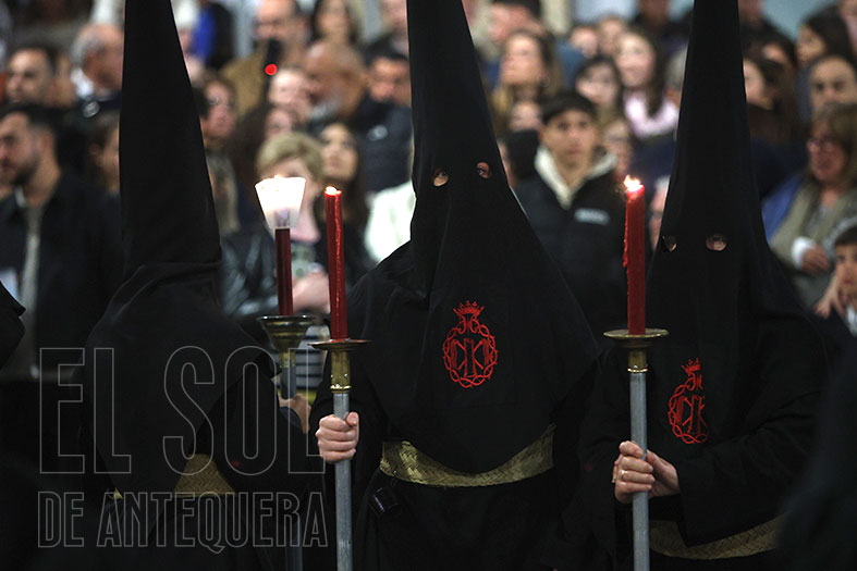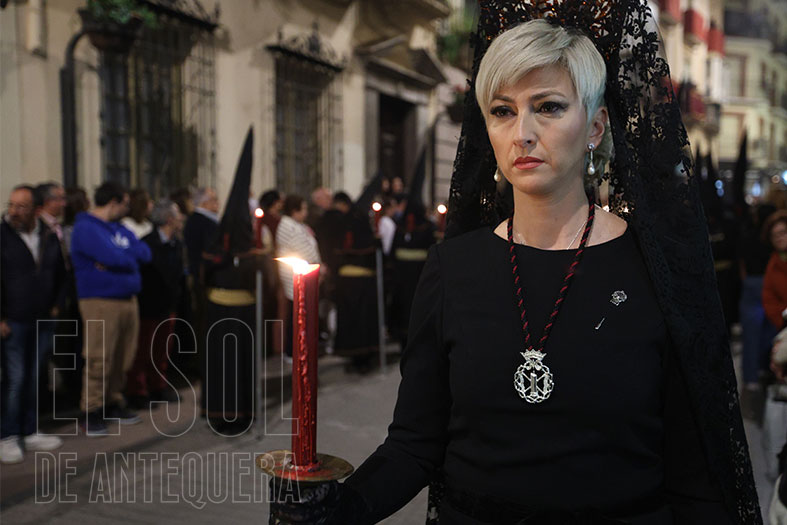 Noche de Miércoles Santo en Antequera. Tras el bullicio, el delirio y el soleado mediodía en los anexos de San Sebastián, llegó la procesión penitente. Gran respuesta del público en las calles y balcones. Devociones en mil formas en el cortejo: penitentes, devotos descalzos, hermanacos con los ojos cerrados… es el sentir del Señor de Antequera en su Mayor Dolor.