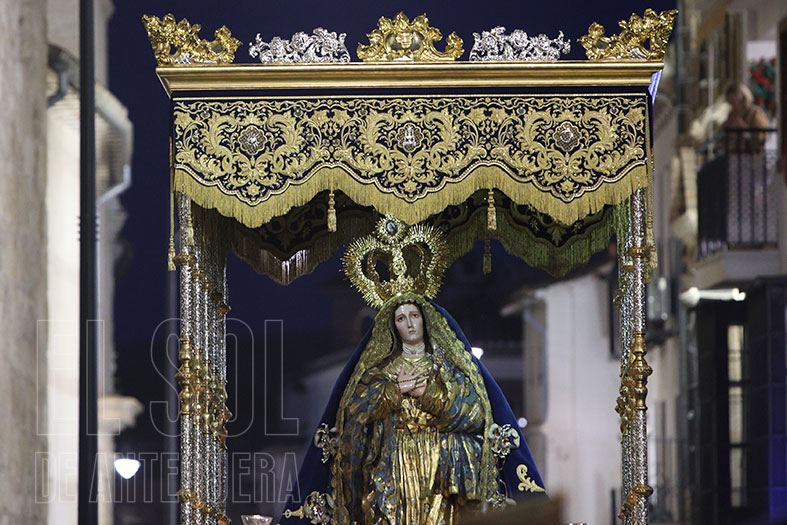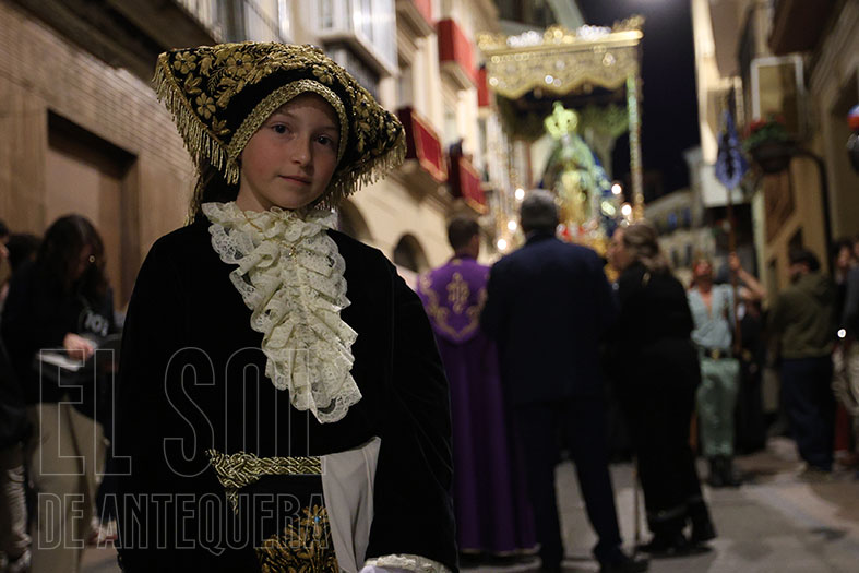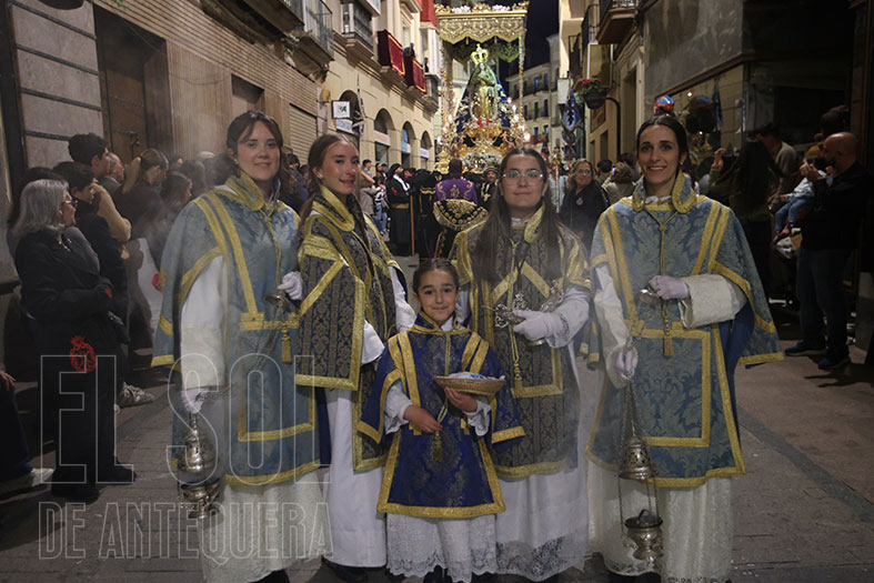 Seguía el impresionante cuerpo de mujeres vestidas con mantilla, el guion oficial con la representación municipal y la de la Legión. Acertadamente, tras ellos, los penitentes que abrían paso a tres jóvenes con dalmática que abrían el tramo de la Virgen con tres faroles antequeranos. Campanillera de lujo, cuerpo de acólitas con dalmática y Andrés Calvo Gómez  al frente del palio de la Virgen. Fue mecida con acierto, superando la fragilidad del esbelto altar. Marcaba el paso, la Asociación Músico–Cultural Banda de Música de Rincón de la Victoria.