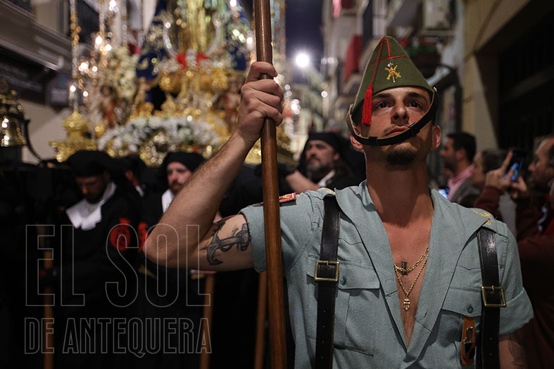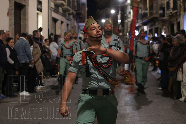 Se notó una mejoría del cortejo, más ordenado, más compacto, recordando al buen hacer de los dos días anteriores. La Legión que abre el cortejo, seguido de penitentes que alumbran al paso del Señor, con Jesús Díez de los Ríos Fuentes al frente y dos tambores que marcan el corazón de los devotos, repartidos en un mar de oraciones y acciones de gracia. Un joven hermanaco, caminó con los ojos vendados. Recuerdos, presentes y deseos de futuro en una tierna imagen que muestra que el relevo está aquí, siendo la misma sangre, pero en una aventura diferente de la vida.