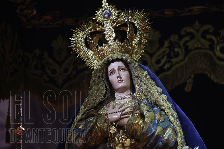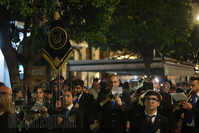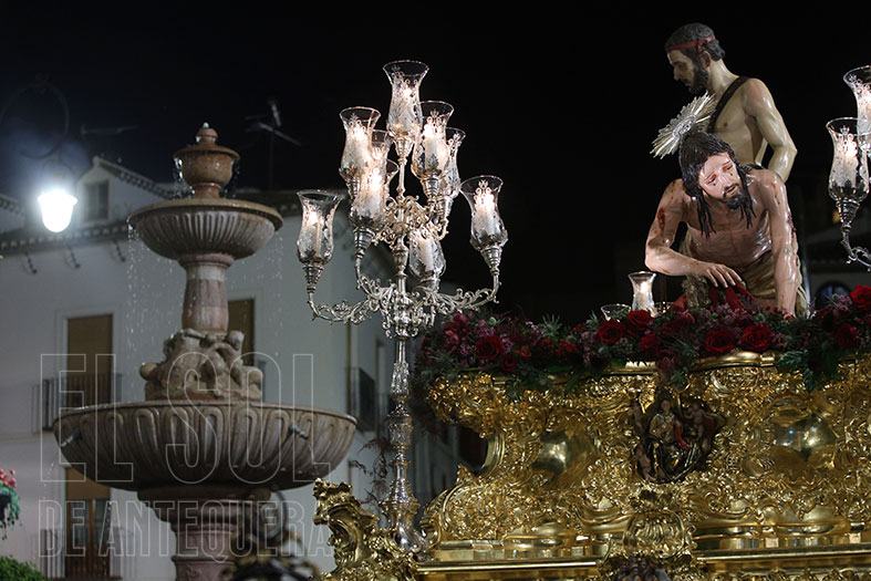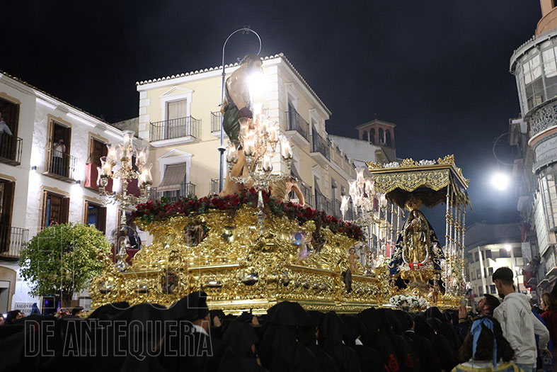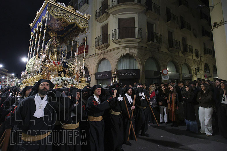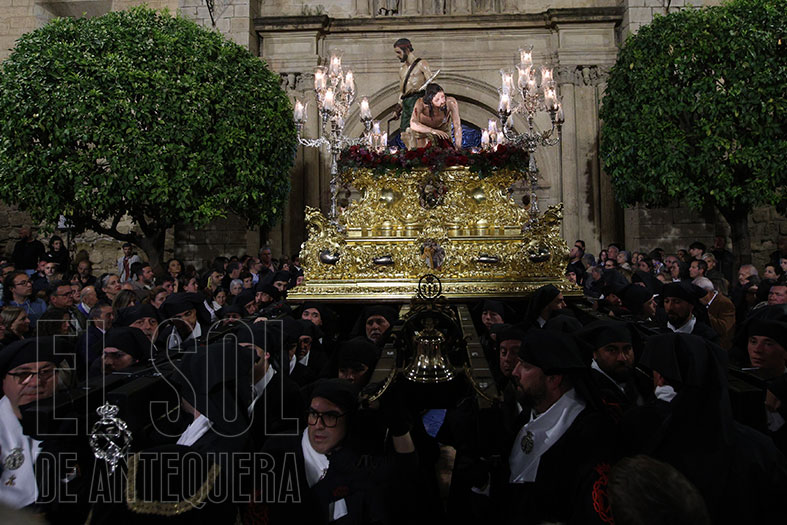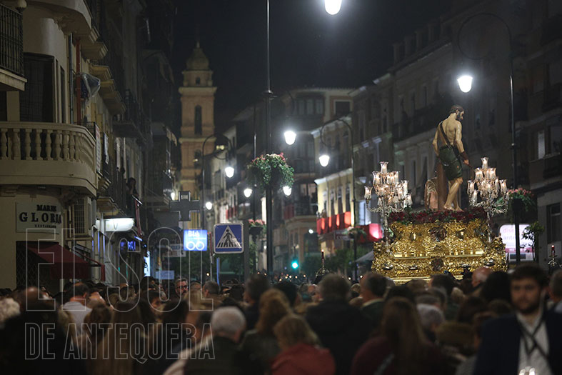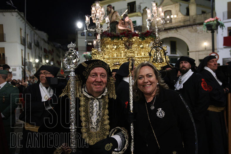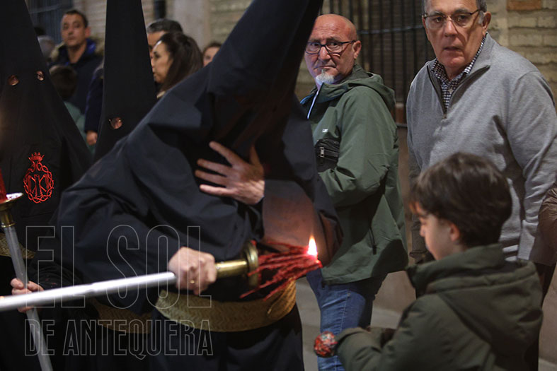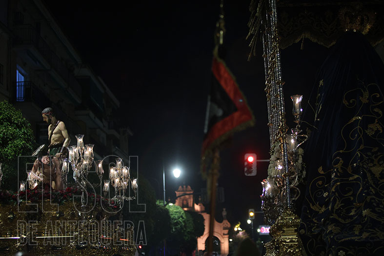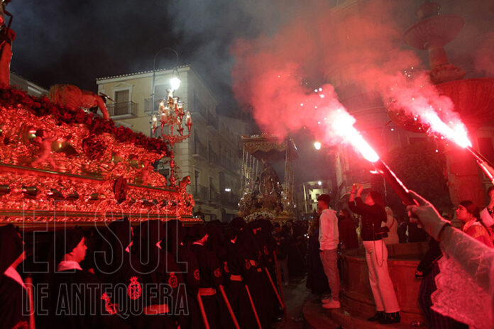 Y de nuevo en San Sebastián, tras 18 horas de pasión por su Señor. Bajo el cántico del «Novio de la Muerte» que ambos tronos se encuentran y bengalas rojas para iluminar la noche. Tras la despedida, el Señor regresa por la puerta principal y la Virgen por la de calle Encarnación. Terminaba un intenso Miércoles Santo con mucha pasión y devoción por las imágenes más visitadas durante el año en Antequera.