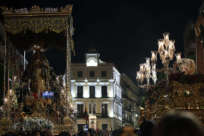 Concurrida San Sebastián, San Agustín y notable bajada por Lucena y Cantareros. Encuentro de ambas imágenes en la Alameda y entrada por Infante don Fernando. El Señor, caminando con el redoble del tambor, el paso firme de sus hermanacos y la tribuna en pie que aplaudió su tránsito. Y tras Él, la Madre, que tras saludar a la Virgen de los Remedios, entró meciendo muy bien al son de «Aurora».