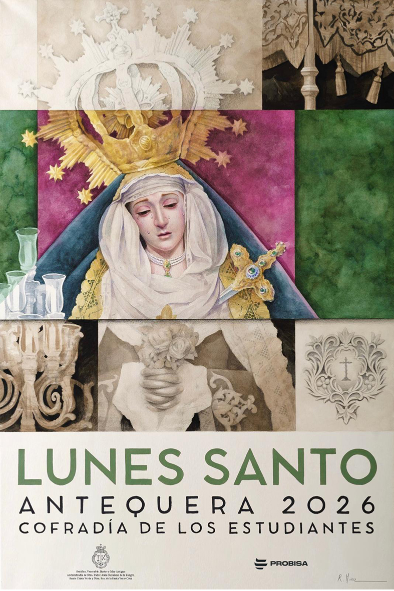 Fue cuando pidió al hermano mayor de la Cofradía, David Artacho, así como a las dos camareras de la Virgen, Isa Ríos y María Victoria Ortiz para que desvelaran el Cartel y tras una fuerte ovación, lo describió: “Esta obra, ejecutada mediante una sofisticada técnica mixta que alterna acuarela, lápices de color, grafito y acrílico sobre papel prensado de una proporción de 50 por 70 centímetros, presenta una composición dividida en secciones perfectamente geométricas que estructuran el relato visual de esta nuestra Hermandad” con la Vera Cruz como guía.