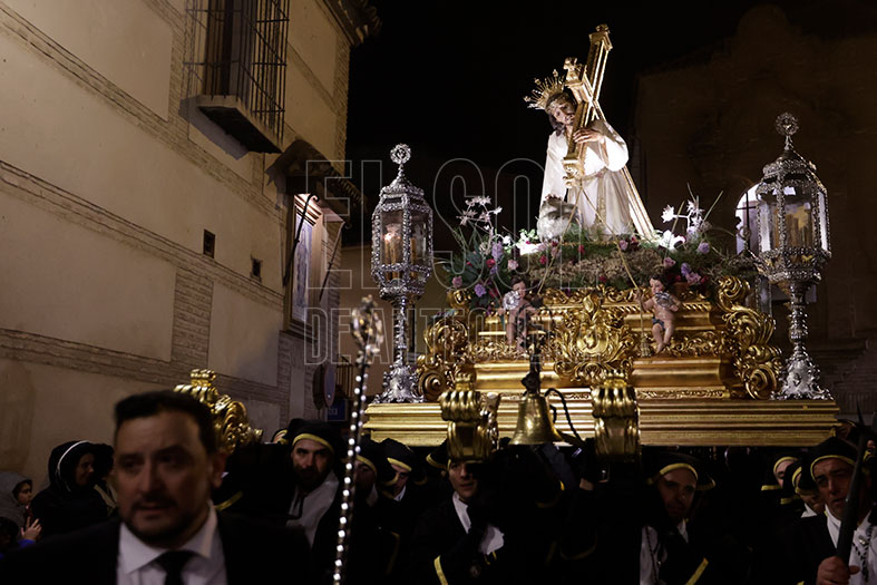 Saludos efusivos entre los de San Pedro y Belén, paso ligero de los tres tronos y las aceras que suspiran por lo que se ha solido vivir en Santiago. De nuevo un acelerón de la marcha y los tronos que llegan a Santiago. No hubo «vega» ni «encuentro» de los tres tronos. Fueron directos para Belén y entraron uno a uno, con petaladas (habría que recordar que no es recomendable los pétalos con el agua y el oro) y mecidas últimas al son de Las Flores.