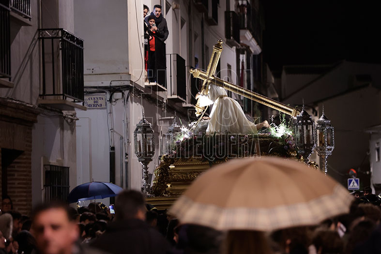 Empezamos por el principio. Se suspendió el desfile de la armadilla por la lluvia. Se esperó dentro y fuera de Belén y primera reunión de la junta directiva. La hermana mayor Almudena Caballero comunicaba primero que aguardarían a las 19,30 horas y si todo iba bien, saldrían. Consultas, llamadas, el Consuelo que sale y los Dolores que intentan acortar por Lucena.