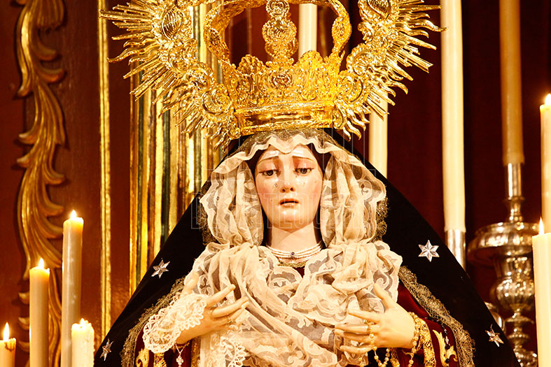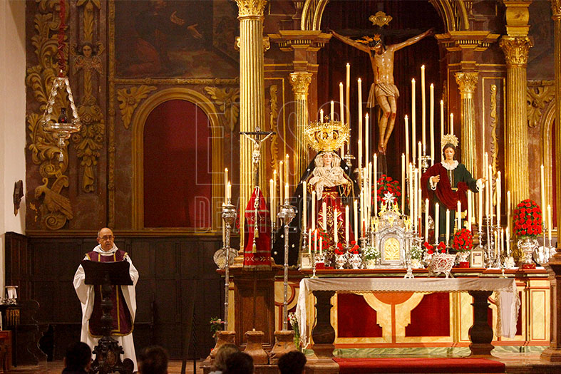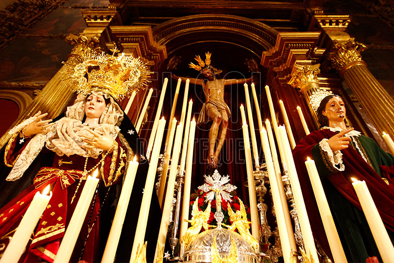 El altar de cultos se ha montado bajo el baldaquino, encima del Sagrario, donde se venera al Cristo de las Penas durante el año. El Cristo de la Misericordia en el centro, flanqueado por la Virgen del Consuelo y San Juan, en una nueva estampa diferente de esta cofradía que está destacando en los últimos tiempos por la puesta en público de sus cultos.