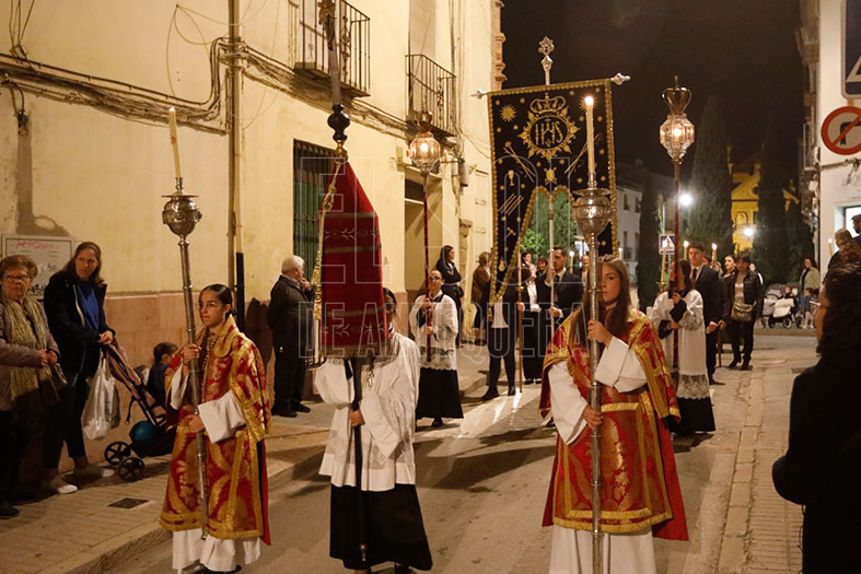 El cortejo lo abrían dos parejas de tres acólitos, la primera de una cruz parroquial con manga y dos ciriales; y la segunda, el nuevo estandarte de Sebastián Marchante, con dos faroles.