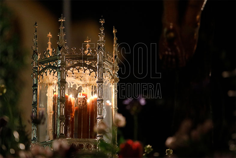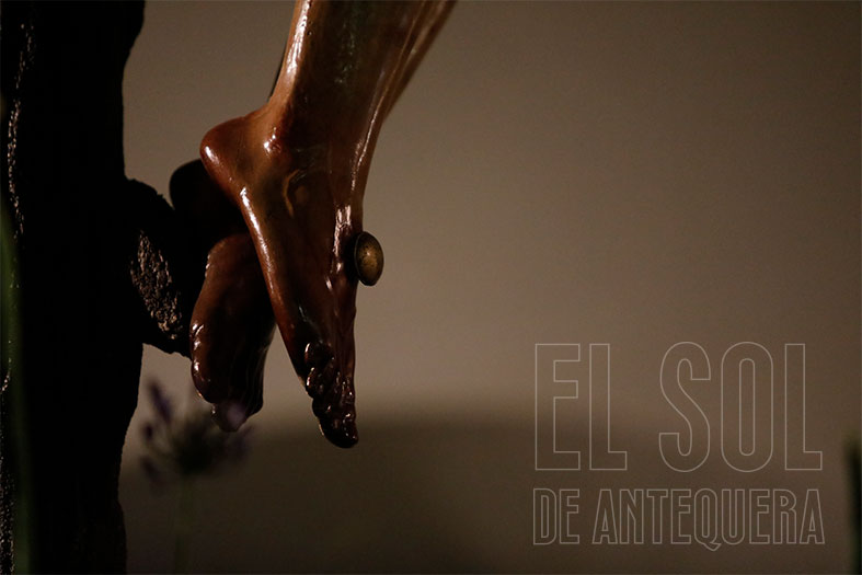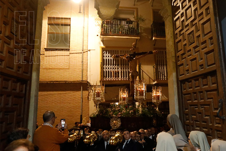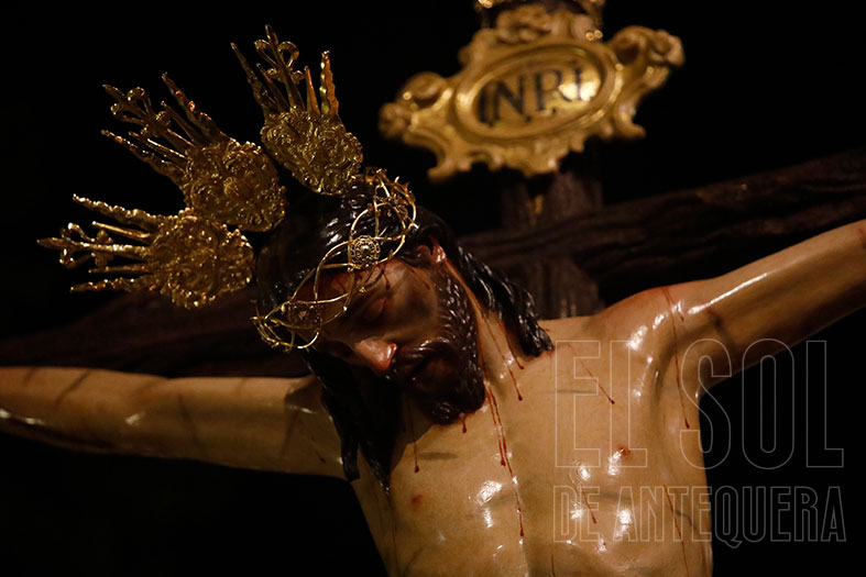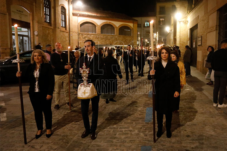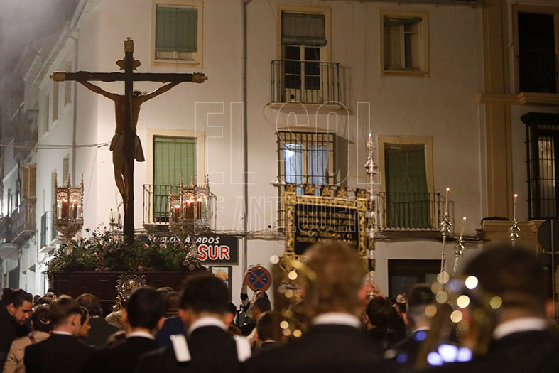 A las 20,30 horas partía desde San Pedro con toda solemnidad y perfección. La cofradía que preside Juan Jesús González consiguió un respeto a pie de calle, fusionando las oraciones de las estaciones de un vía crucis con la música de la Banda Sinfónica Virgen de la Trinidad de Málaga. Un centenar de músicos que marcaban el paso del trono, algo no habitual en los vía crucis de Antequera por la calle con imágenes procesionales.