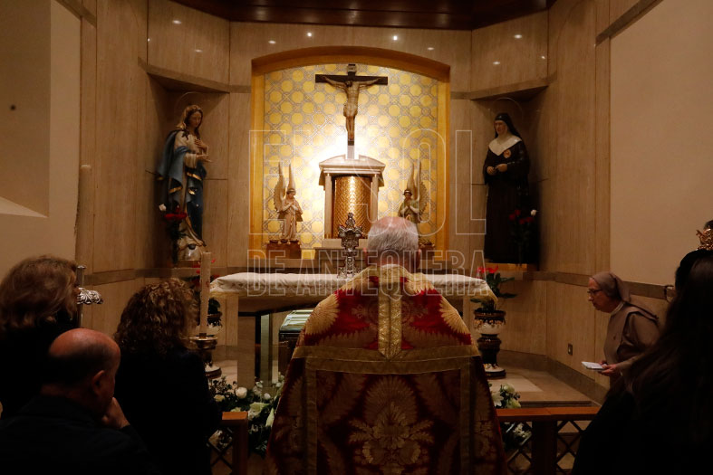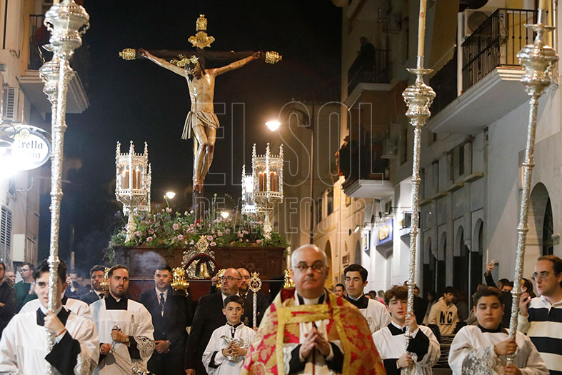 A continuación, el párroco Francisco Aurioles con capa pluvial, en su sitio, como marcan estos actos piadosos en la calle. En su papel, atento a la oración. Cuerpo de acólitos con ciriales y turiferarios y el trono del Cristo.