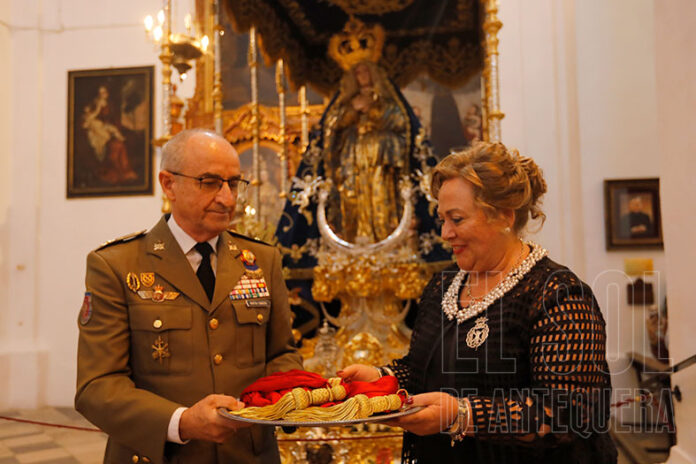 El general Juan Jesús Martín Cabrero entrega su faja de honor a la Virgen el Mayor Dolor de Antequera