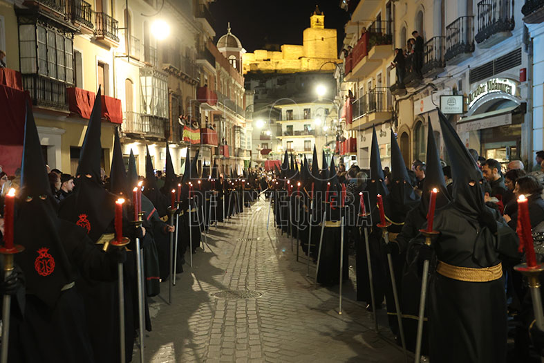 Y a las 21 horas, se abrieron las puertas y empezó a salir el cortejo por ambas, ordenado y con la complejidad de la salida de los dos tronos. Se dieron los «arribas» y comenzaba el recorrido. Primero por Infante don Fernando hasta llegar a San Agustín para bajar por Lucena.