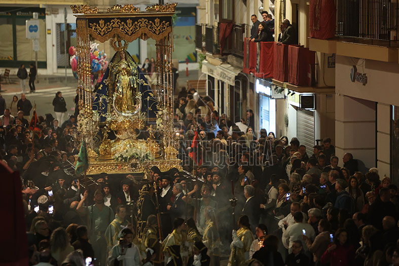 Entra primero la Virgen y luego el Señor, en cuyo momento justo, la pequeña llovizna que cayó desde las Cuatro Esquinas, se hace más fuerte. El Tercio de La Legión abría la procesión, tambores tras el Señor de la Asociación Músico–Cultural Banda de Música de Rincón de la Victoria y la Asociación Músico–Cultural Banda de Música de Rincón de la Victoria tras la Virgen.