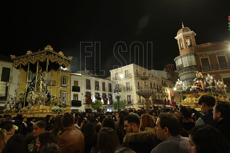 Entrada por la calle principal, saludo a la Virgen de los Remedios y paso por Tribuna. La amenaza de lluvia y los problemas con el palio llevan a suspender la quema de bengalas y el «encuentro» entre ambos tronos. Al bajar la Virgen rumbo a Encarnación, aunque el Señor sí da la vuelta al fuente mientras que La Legión de Melilla canta el «Novio de la Muerte».