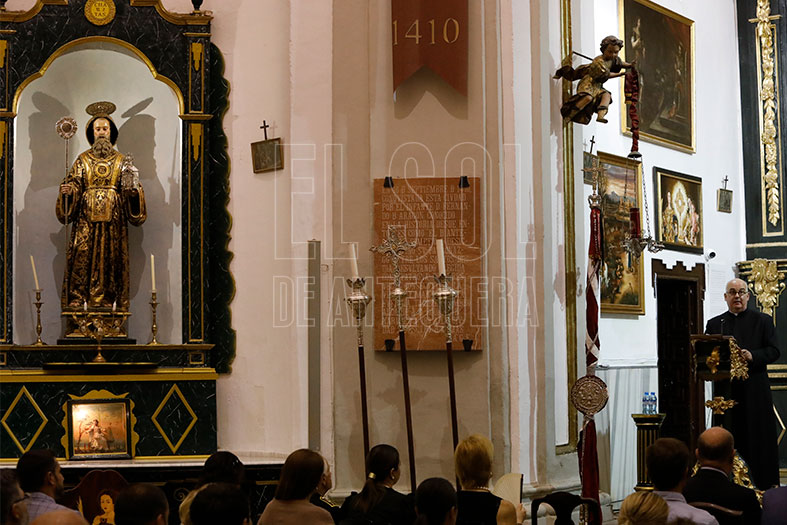 El sacerdote tomó la palabra y fusionó en una lección magistral sus conocimientos históricos con sus convicciones religiosas y sus valores personales. Una presentación que presentó un cartel, exponiendo la importancia de Eufemia en la cristiandad y en Antequera.