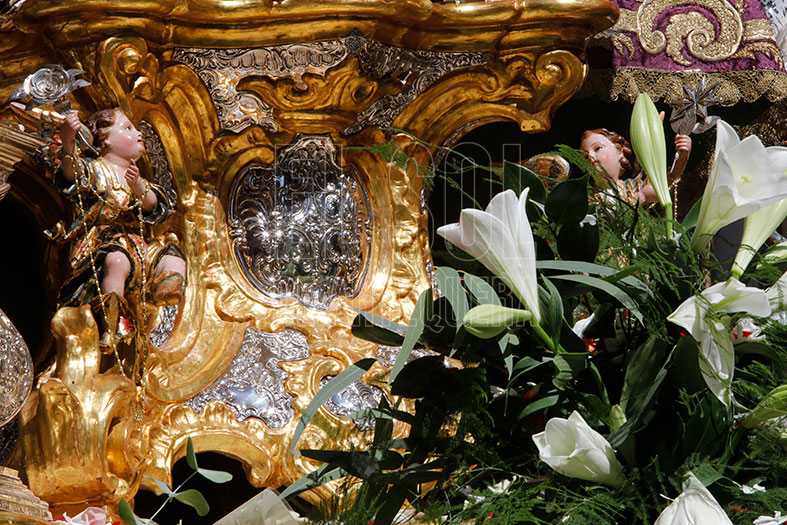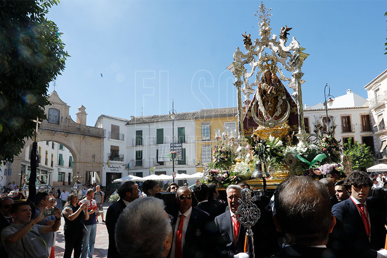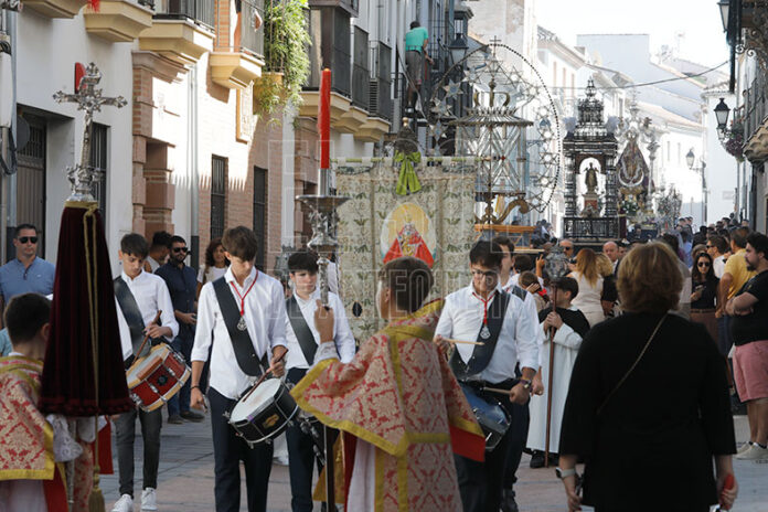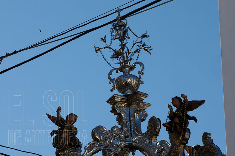 La procesión de la Virgen del Rosario se ha desarrollado en la mañana del domingo 5 de octubre con 30 grados, un calor intenso, un cuerpo procesional muy joven, la plata del templete reluciendo y un ordenado y ágil cortejo que alza a los de Santo Domingo como una procesión de Gloria que implica a las calles de su recorrido en Antequera.