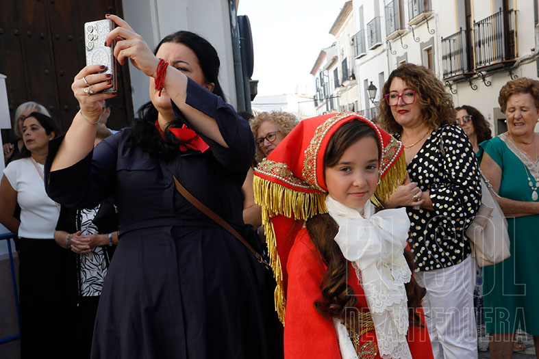El cortejo lo abría una cruz parroquial con dos ciriales, portados por tres acólitos con dalmática. Seguía un acertado grupo de jóvenes con tambores, marcando el paso de los dos faroles del Rosario de la Virgen. Entre medias, el estandarte de los patronos y el guión presidencial, con el alcalde Manuel Barón, los guiones del Rosario y de La Paz y el hermano mayor Enrique Cruces, al que le acompañaban representantes de cofradías de Gloria y Pasión. Por cierto, que se estrenaba el escudo de la cofradía en el guión.