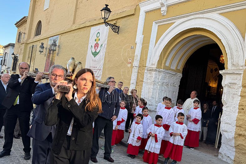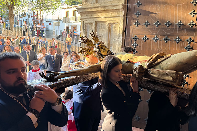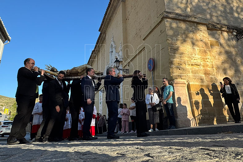 Su hermano mayor de insignia, Juan José Sánchez, ordena su «bajada» para ser llevado a hombros en una procesión solemne, breve, pero intensa. La Cruz de las Glorias abre el cortejo que sale por la puerta lateral, seguido del Señor. Tras Él, el Párroco, el alcalde Manuel Barón y devotos alumbrándole.