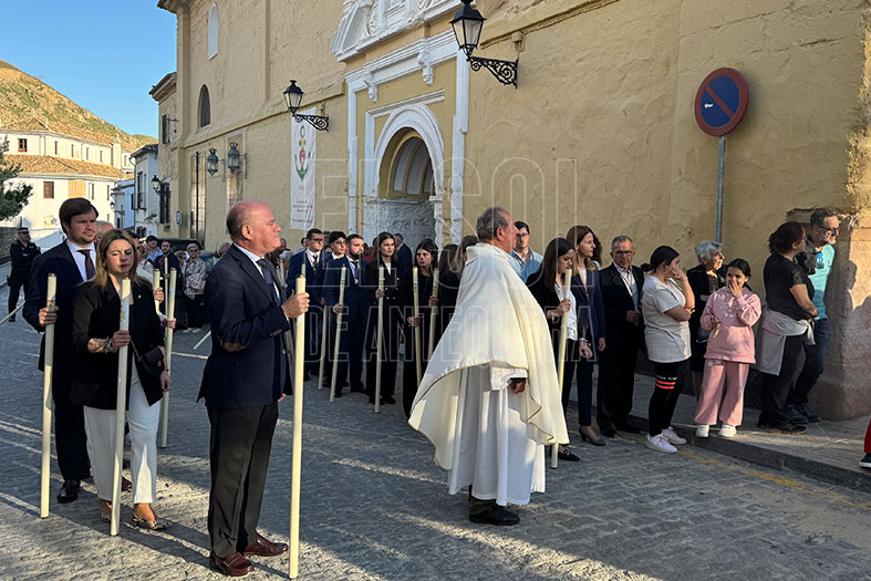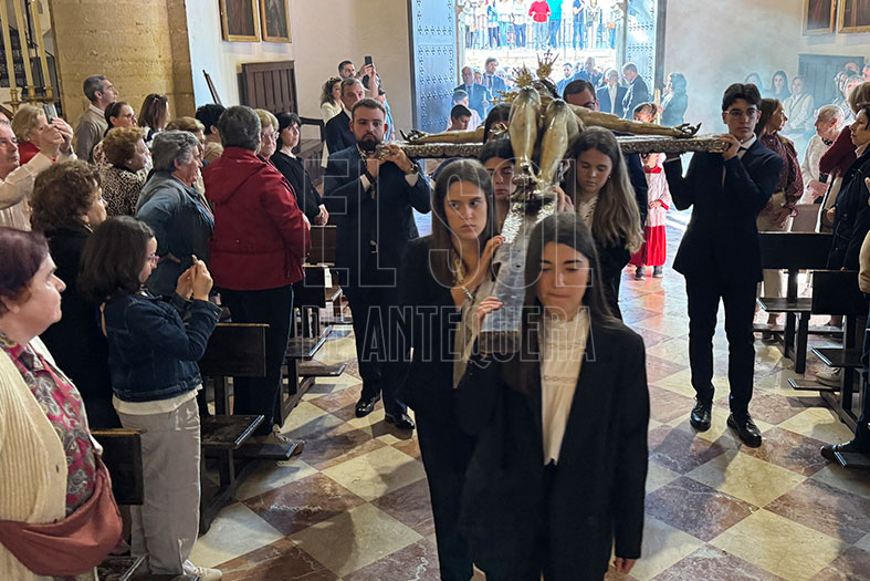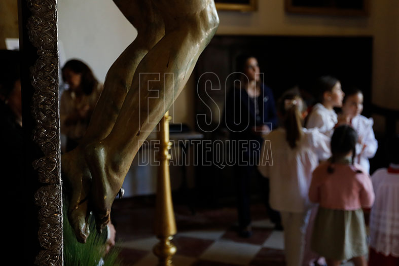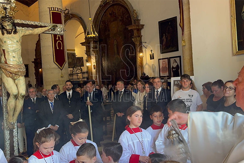Llegó las 19,30 horas y en punto, como siempre busca la Real Hermandad del Patrón de Antequera que preside Gabriel Robledo, su párroco, el bueno de Tomás Pérez, que reza y pide a los niños, vestidos de monaguillos, que se queden junto a Él.