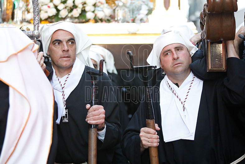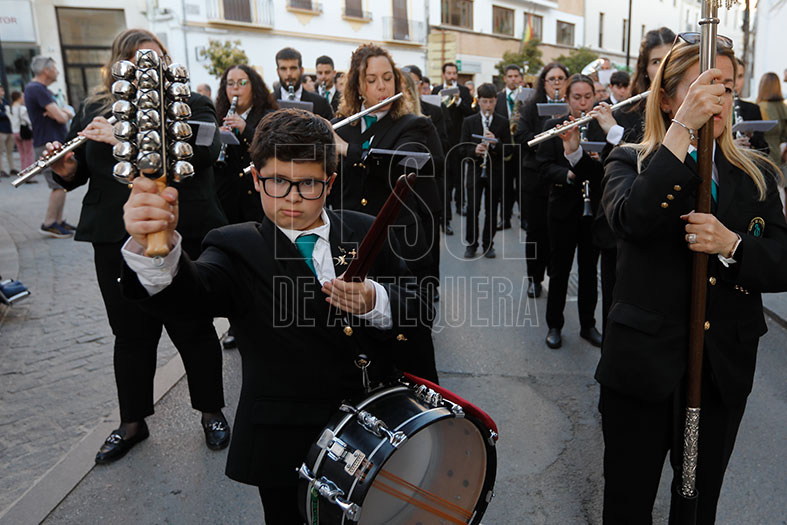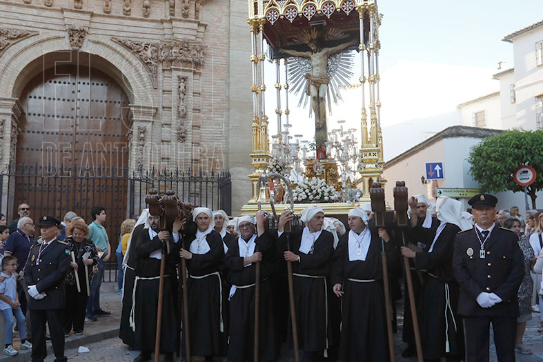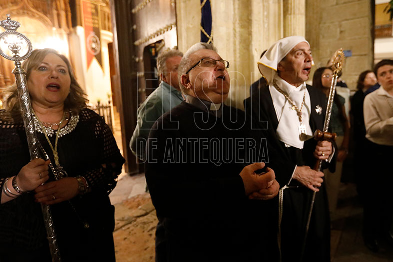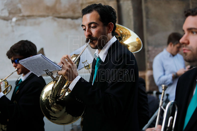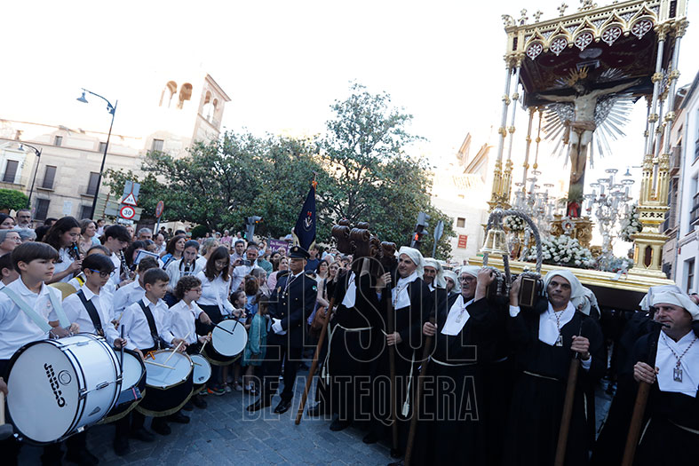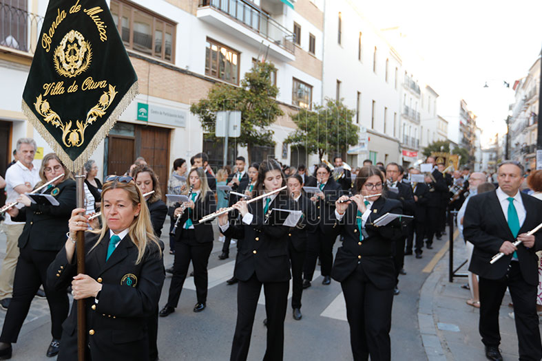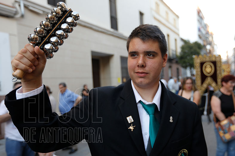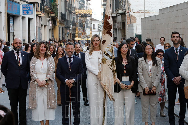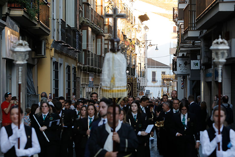 Y empezó a formarse el cortejo subiendo por Niña de Antequera. En primer lugar, la Banda de Otura, magnífica, interpretando una tras otra marcha, entre ellas la de «Señor de Antequera», dedicada al Patrón. Seguía el guión, donde al hermano mayor de la Real Hermandad, Gabriel Robledo, le acompañaban representantes de cofradías de Gloria y Pasión, de la Orden del Infante don Fernando y Santa Eufemia.