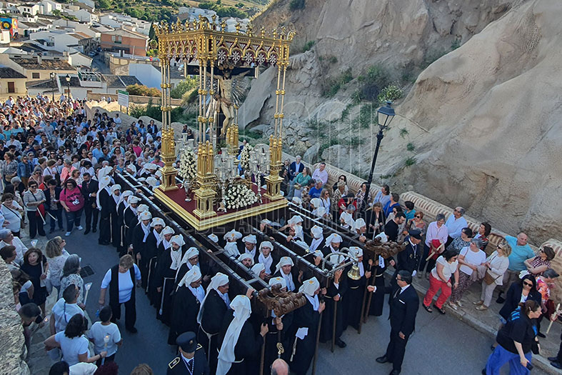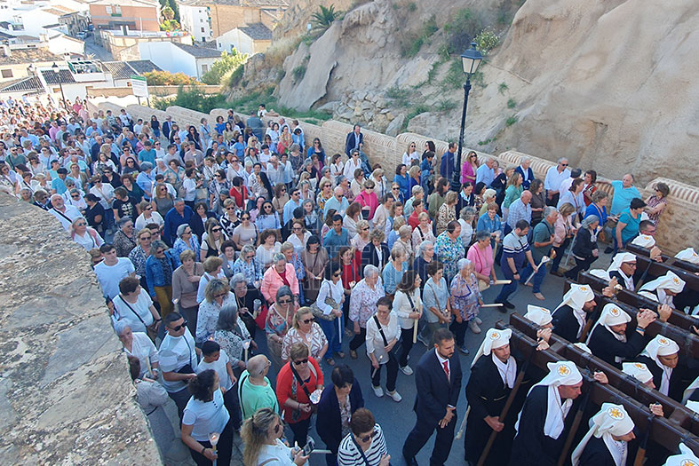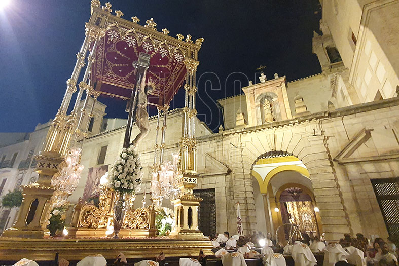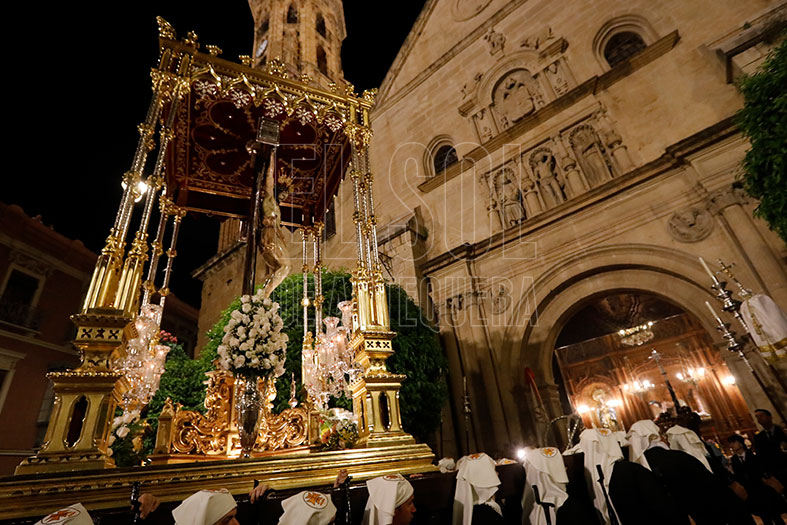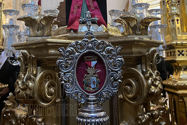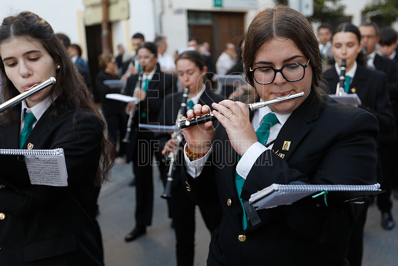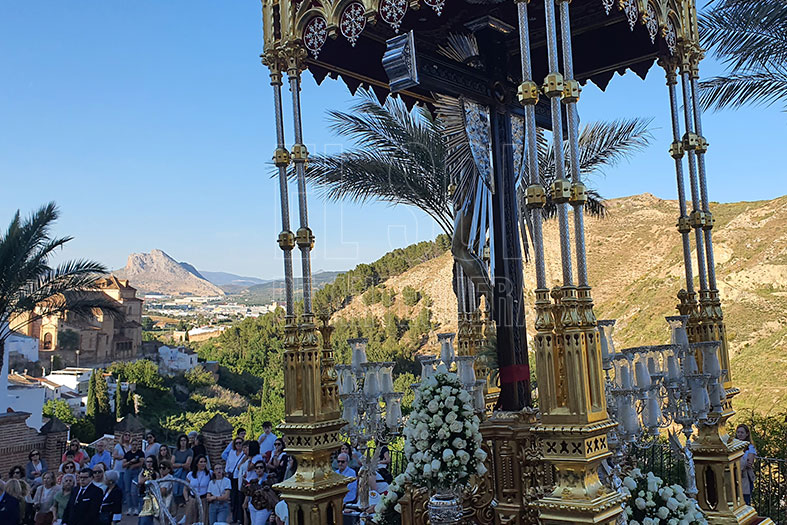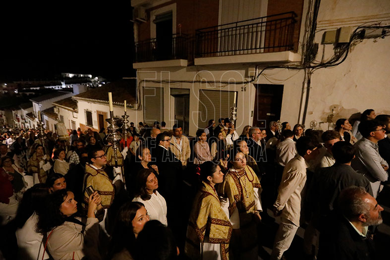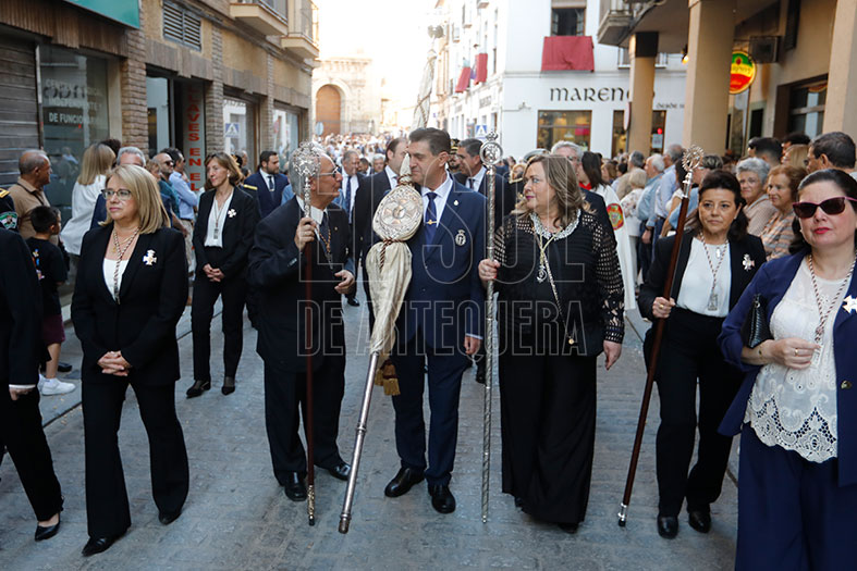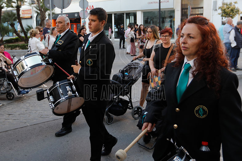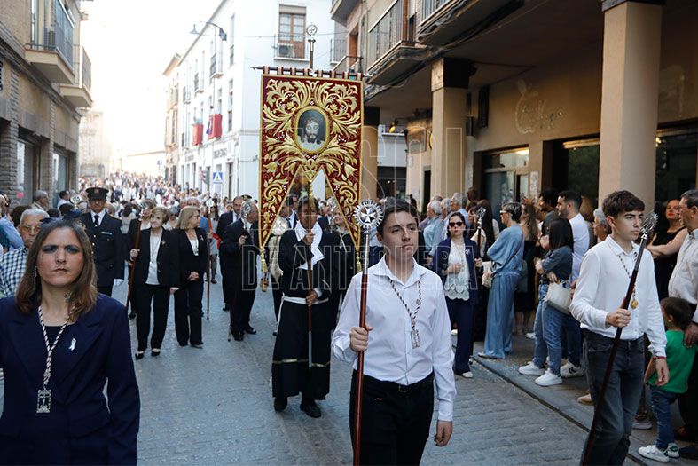 Y empezó a formarse el cortejo subiendo por Niña de Antequera. En primer lugar, la Banda de Otura, magnífica, interpretando una tras otra marcha, entre ellas la de «Señor de Antequera», dedicada al Patrón. Seguía el guión, donde al hermano mayor de la Real Hermandad, Gabriel Robledo, le acompañaban representantes de cofradías de Gloria y Pasión, de la Orden del Infante don Fernando y Santa Eufemia.
