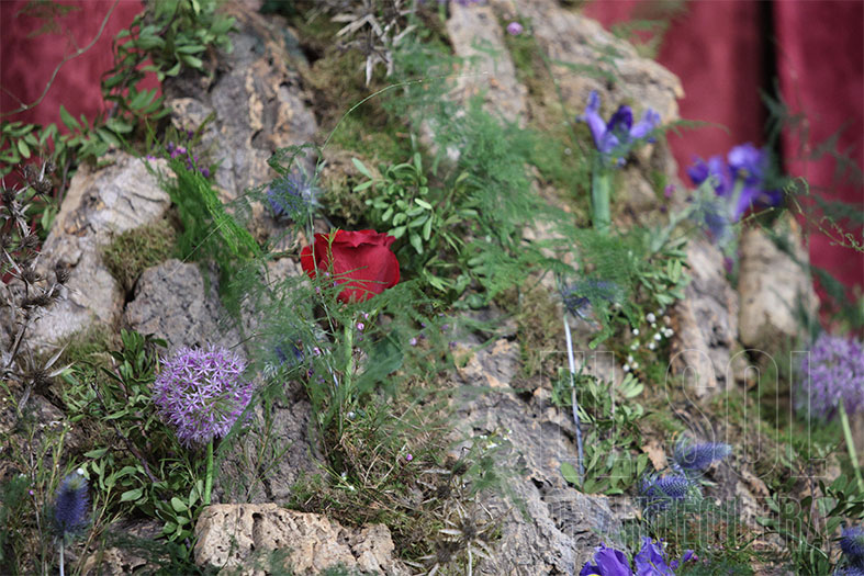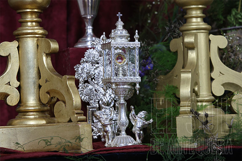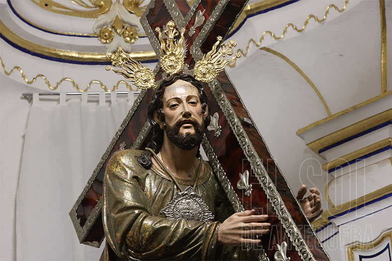 El patrón de los Estudiantes ha presidido el altar mayor, fusionándose en el retablo franciscano, sobre monte y flanqueado por cuatro grandes hachones del Señor de la Salud y de las Aguas. Un rosa roja a sus pies y los relicarios de la hermandad.