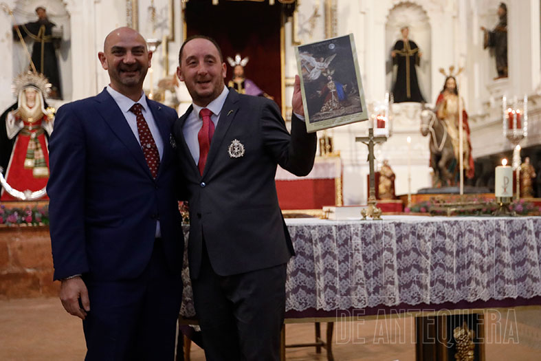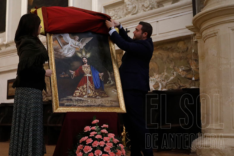 Y es cuando pidió al hermano mayor Antonio González y a la artista, Eva Escobar, a que descubrieran el cartel, siendo recibido con una fuerte ovación. Fue el presagio de lo que luego se constaría. Eva sigue superándose y de nuevo sorprende, sin serlo, se alza como un Cartel de Semana Santa porque canta a Antequera, idealizando la luna de Pasión sobre el olivar entre Menga y la Peña de los Enamorados y entronizando al Señor Orando en el Huerto. Nos recuerda las pinceladas de Goya, Murillo, incluso del Greco, pero con el estilo de Eva Escobar donde muestra conocer le terreno de la Pasión según Antequera.